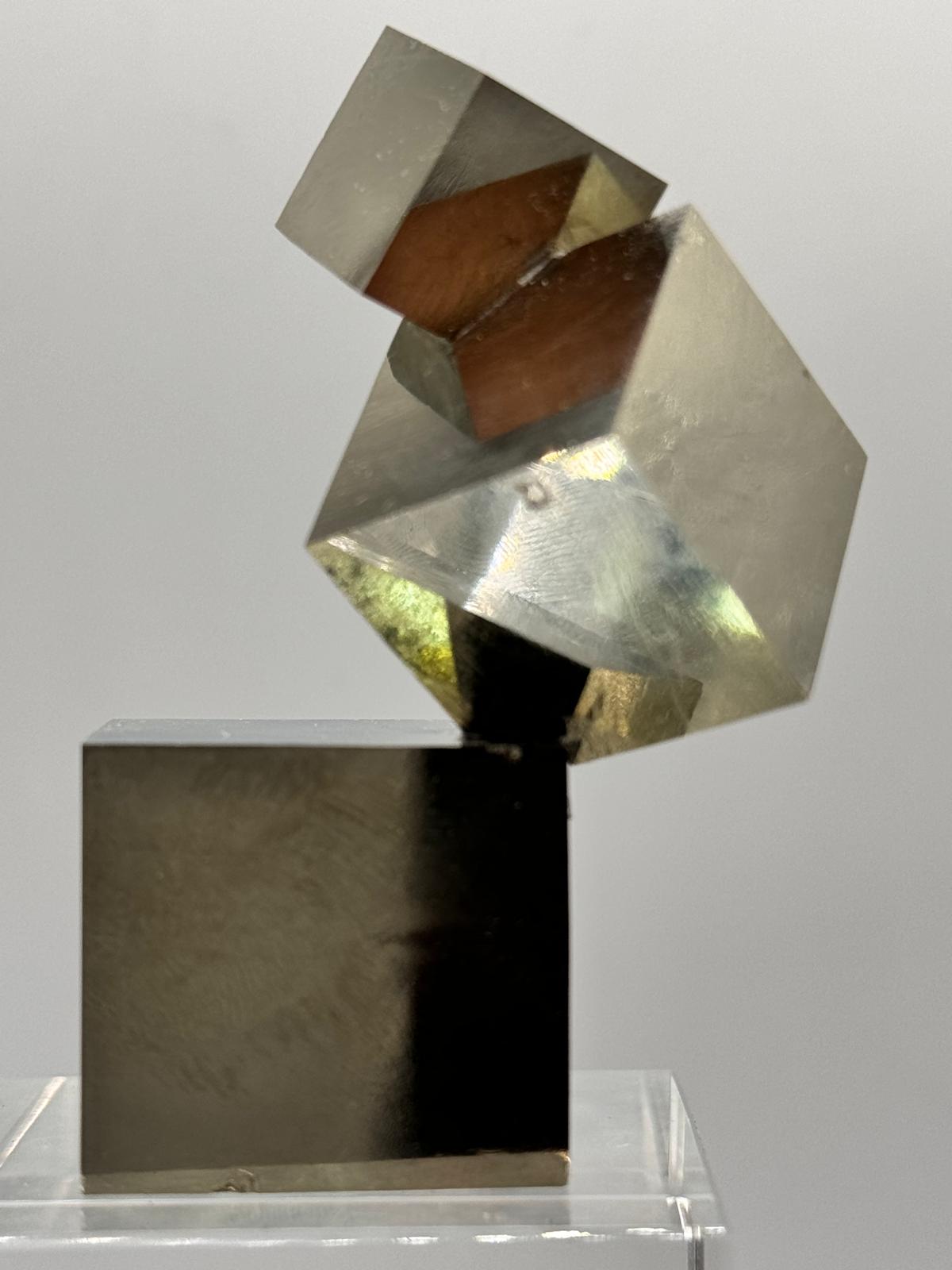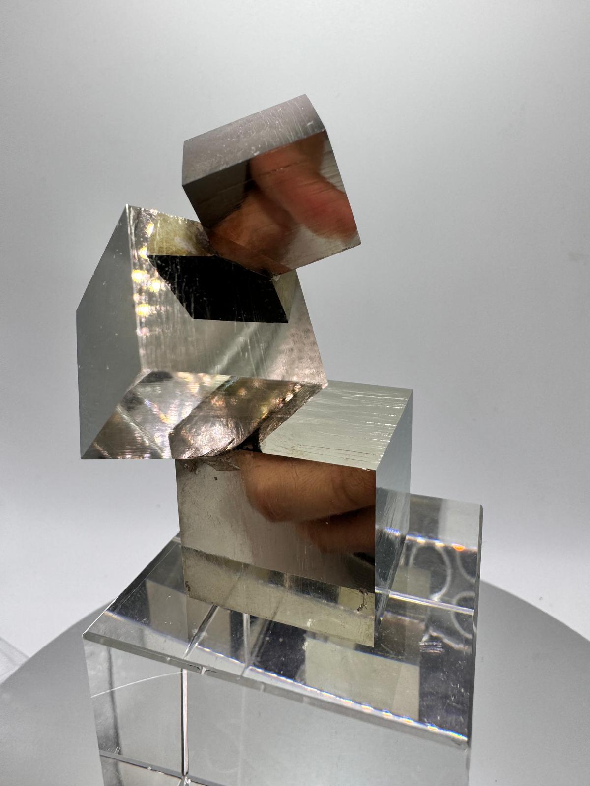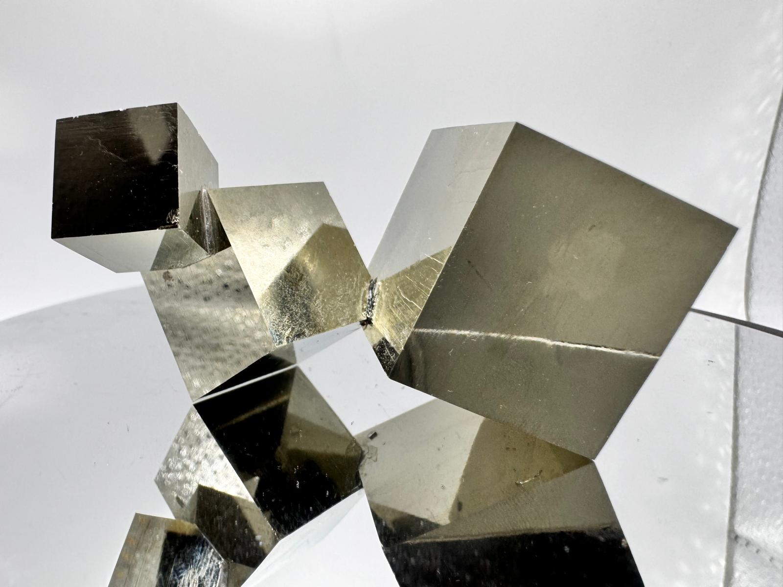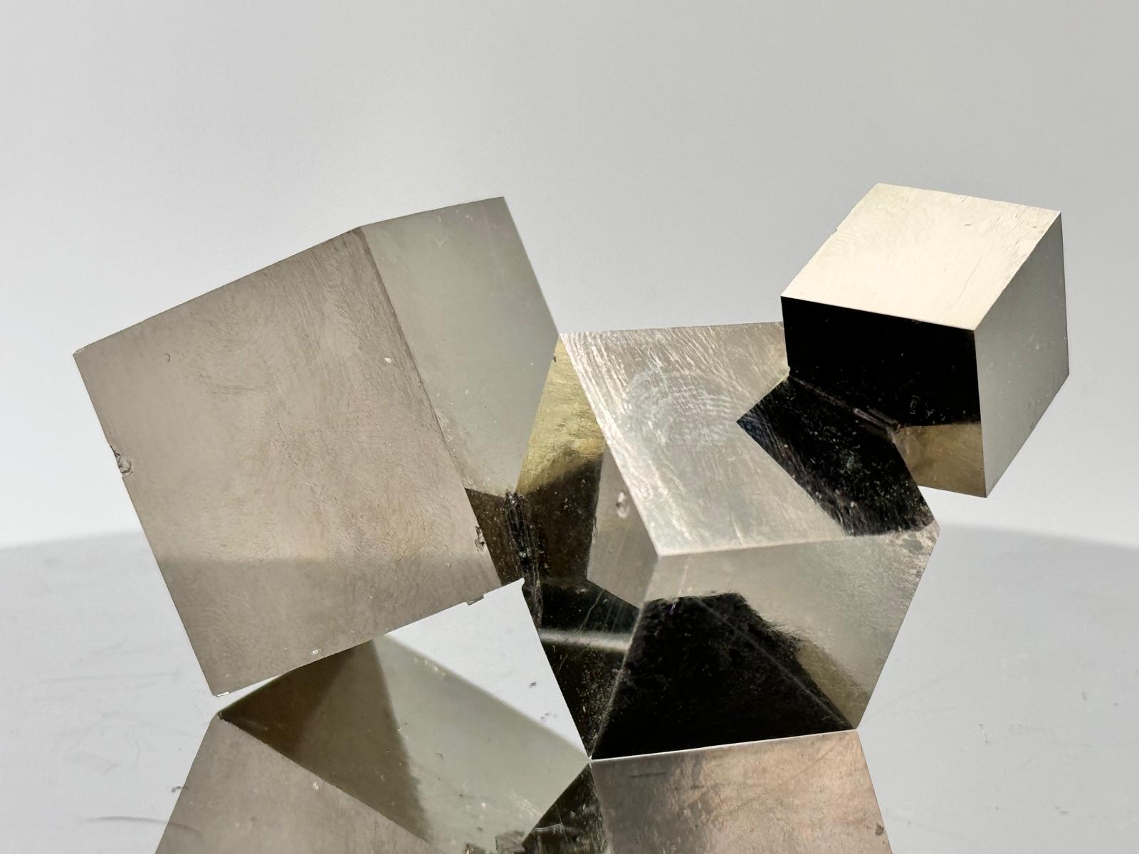 Description: The faces of all 3 pyrite cubes from the famous Navajun have such mirror-like lustre finish and reflections that makes photographing difficult even with the dimming of the lights.