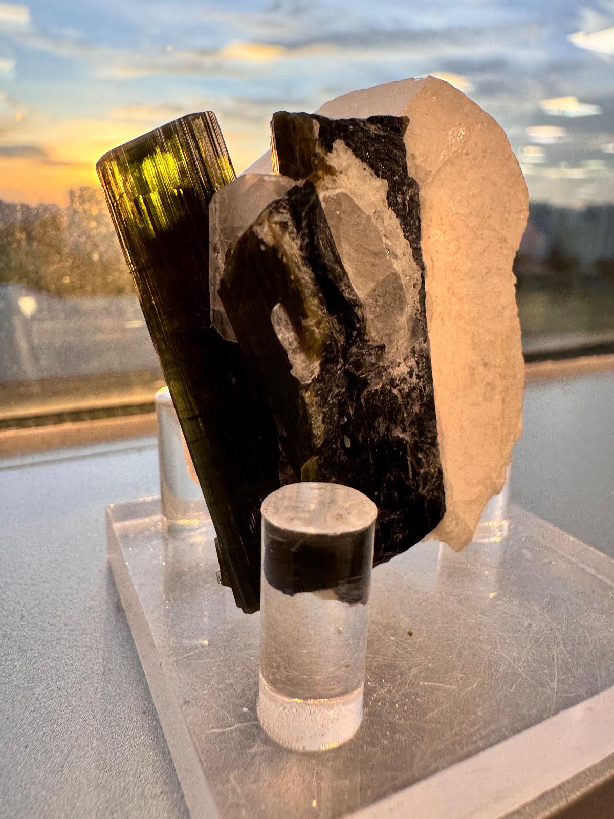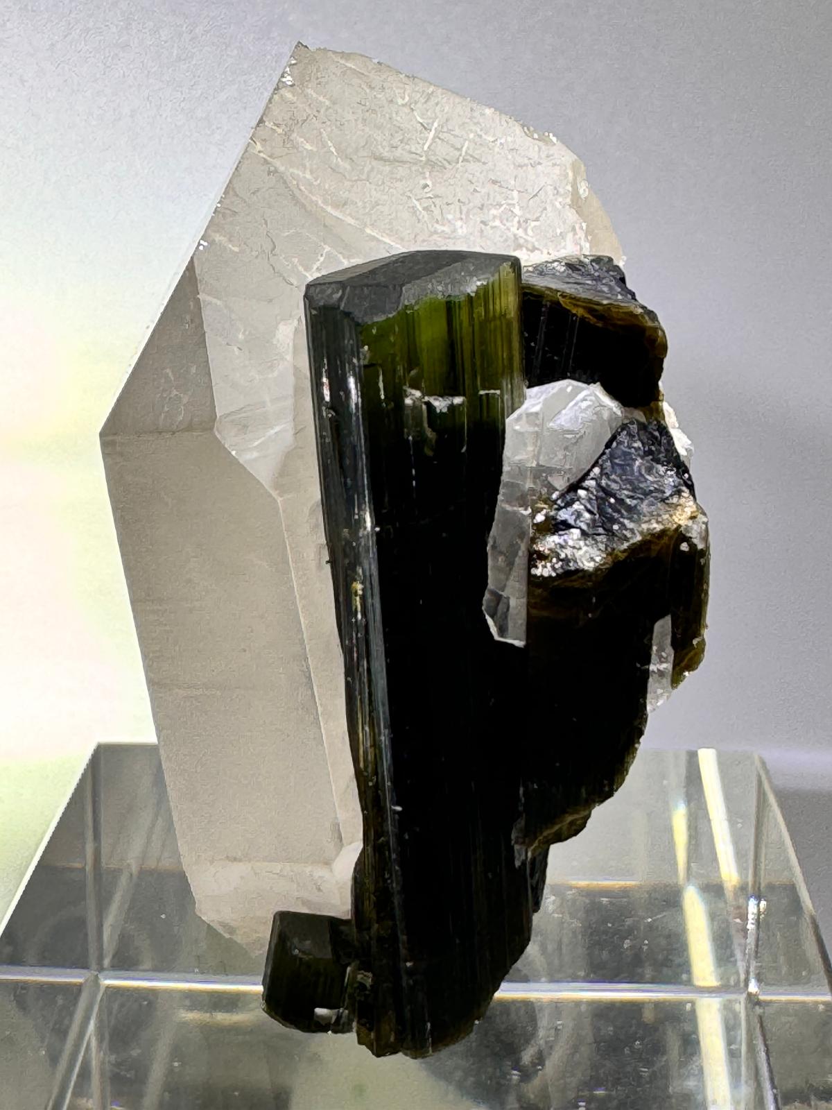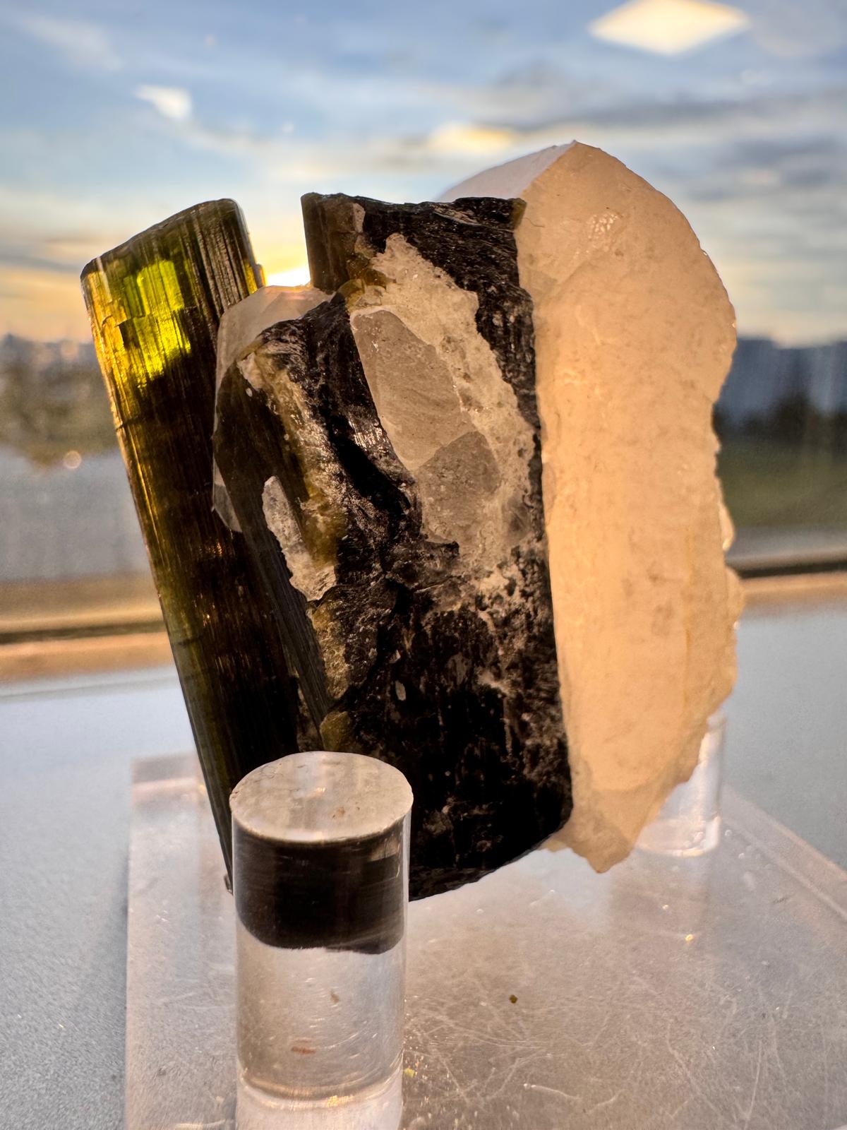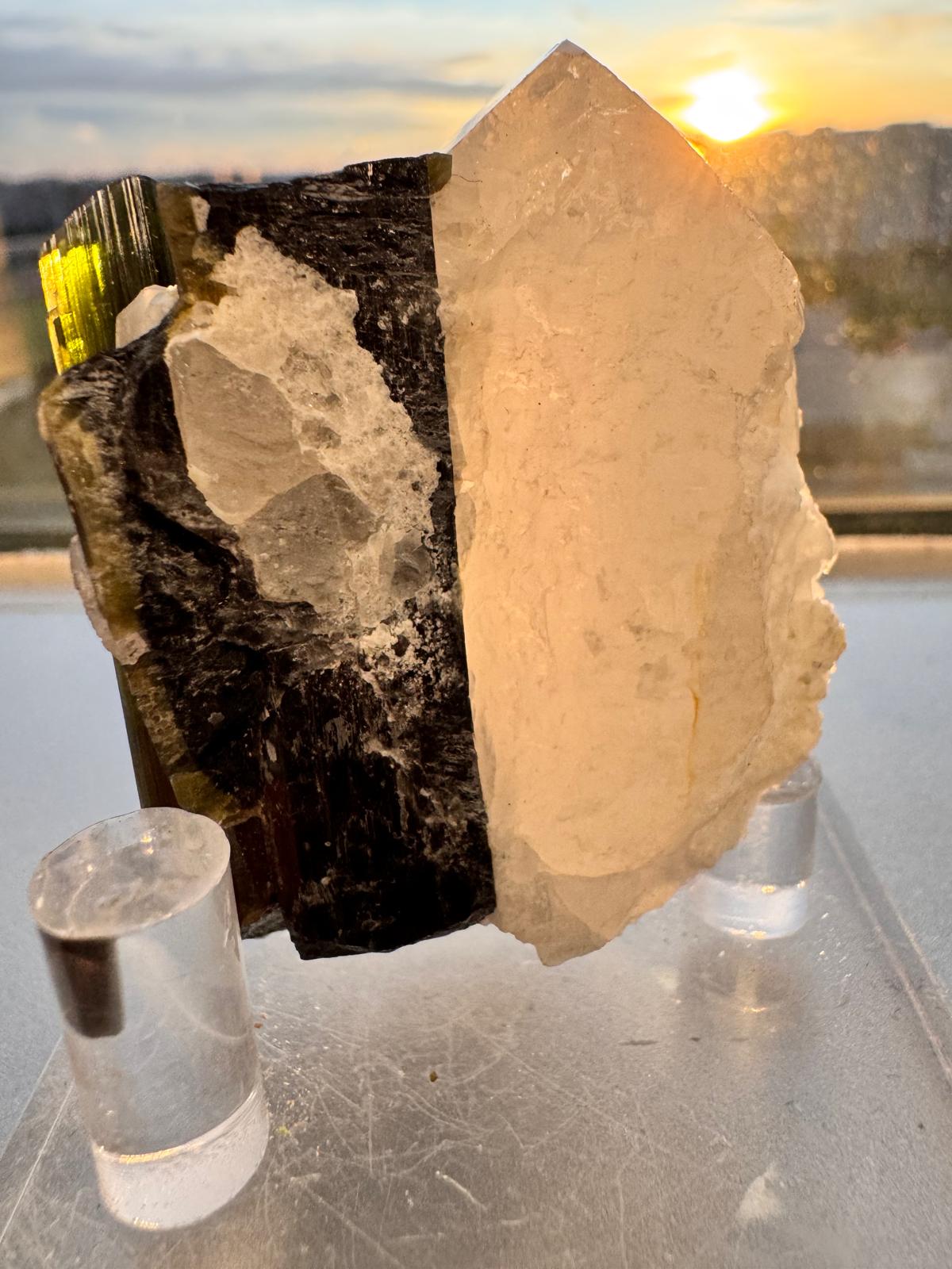 Description: Stunning specimen that features a vibrant green cap tourmaline, beautifully complemented by quartz crystals. The tourmaline’s rich green hue is a testament to the high-quality minerals found in the North Skardu Valley, a region renowned for its gemstones of exceptional quality. The white quartz adds a striking contrast, enhancing the overall aesthetic appeal of this visually captivating specimen and making it a valuable addition to any collection.