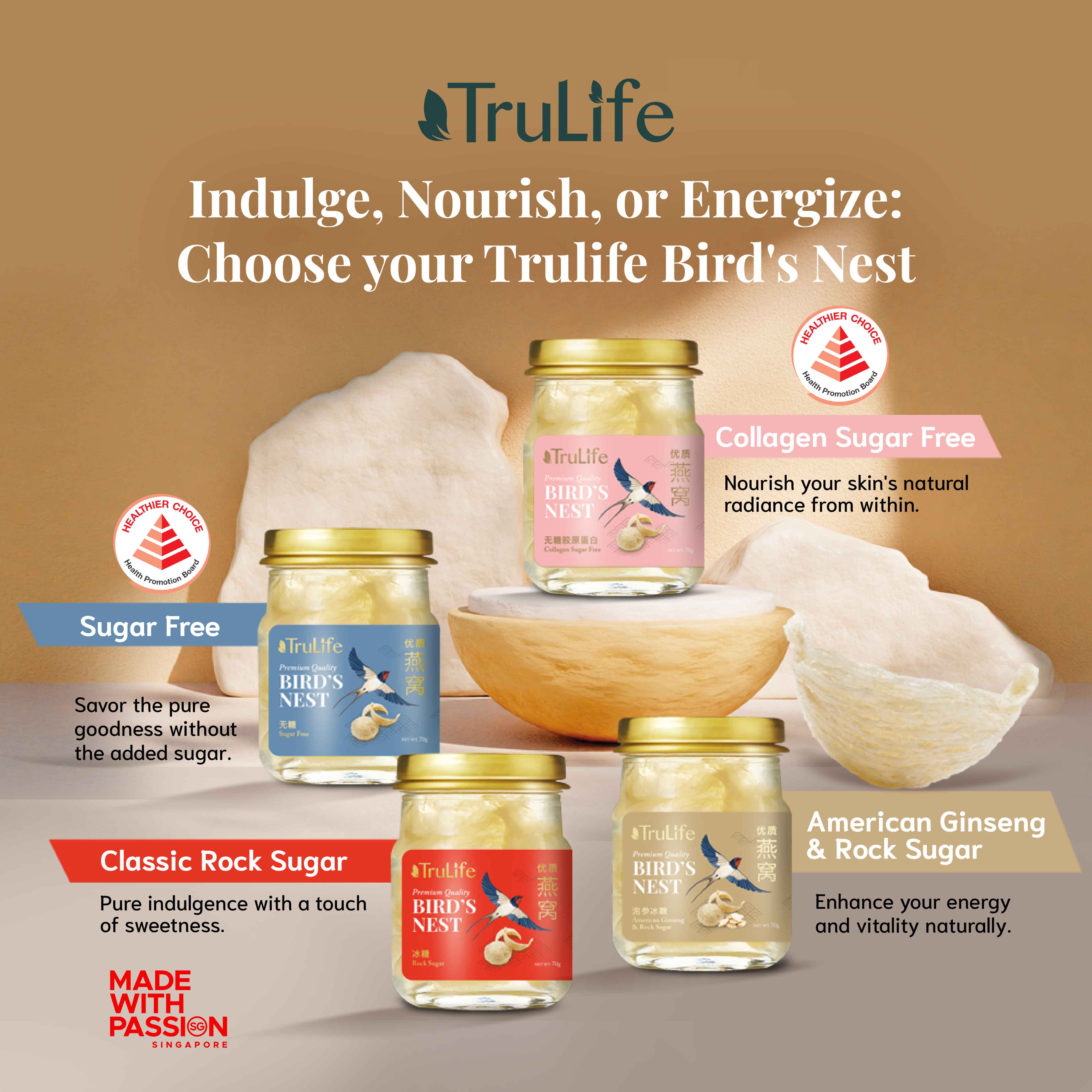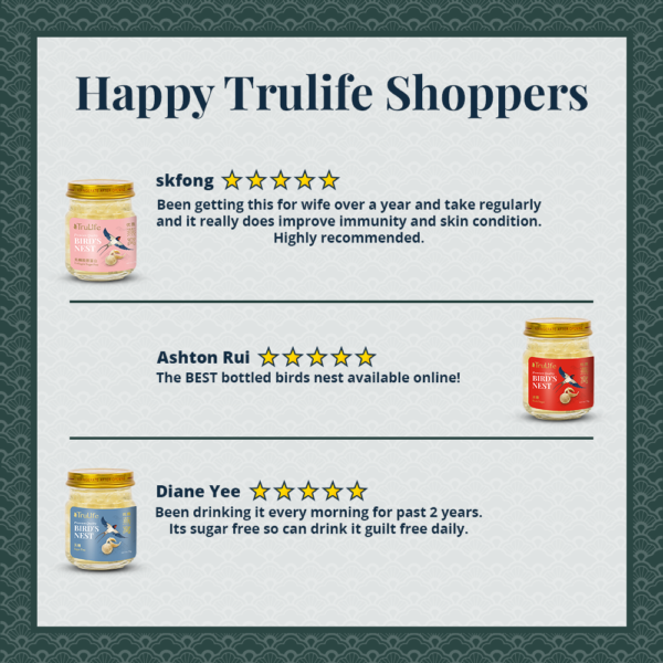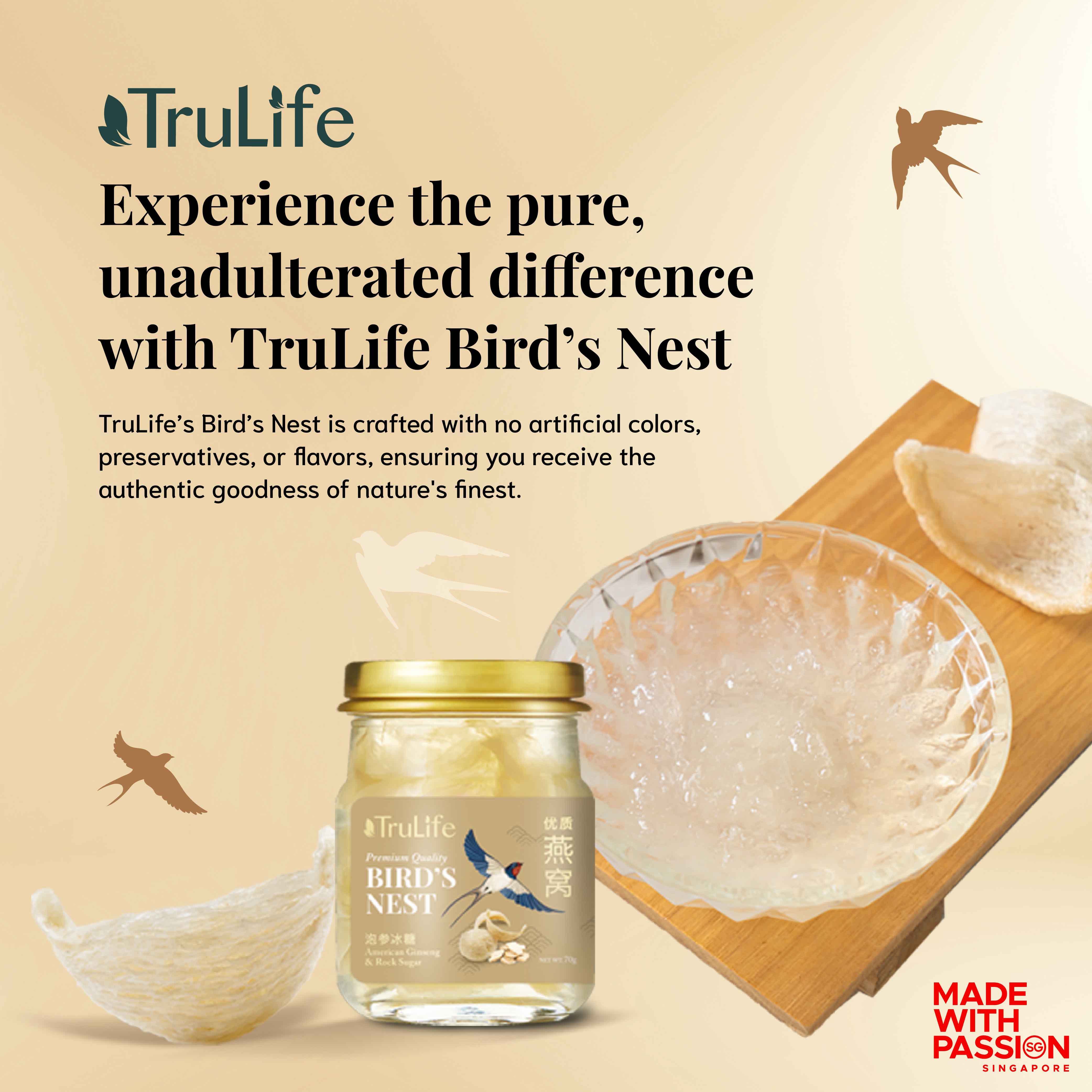 TruLife Premium Bird’s Nest With American Ginseng & Rock Sugar is prepared with only the best grade of 100-percent authentic pure bird’s nest and rock sugar. It contains no artificial preservatives, flavouring or colouring, retaining the nourishing benefits and natural goodness of our traditional best-tasting recipe. The added American Ginseng aids in fighting fatigue, promoting energy.