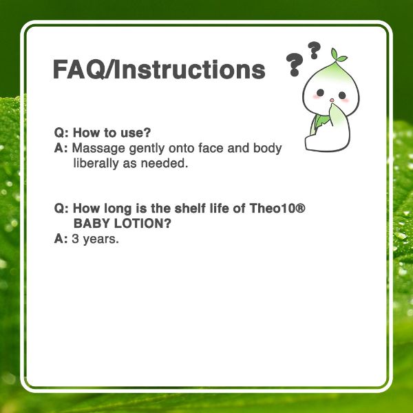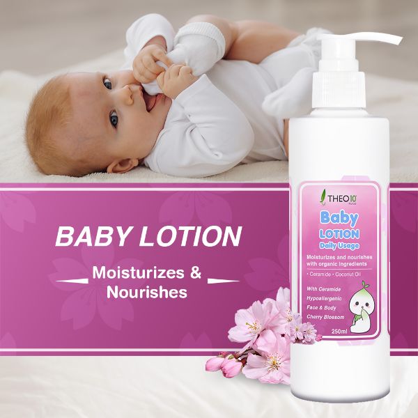- Baths can dry the baby’s skin, so use Theo10®️ Baby Lotion after baths.Clean your hands thoroughly and take a small amount and spread it on the palms and fingers of your hands. Gently massage your baby’s body to spread it evenly all over.