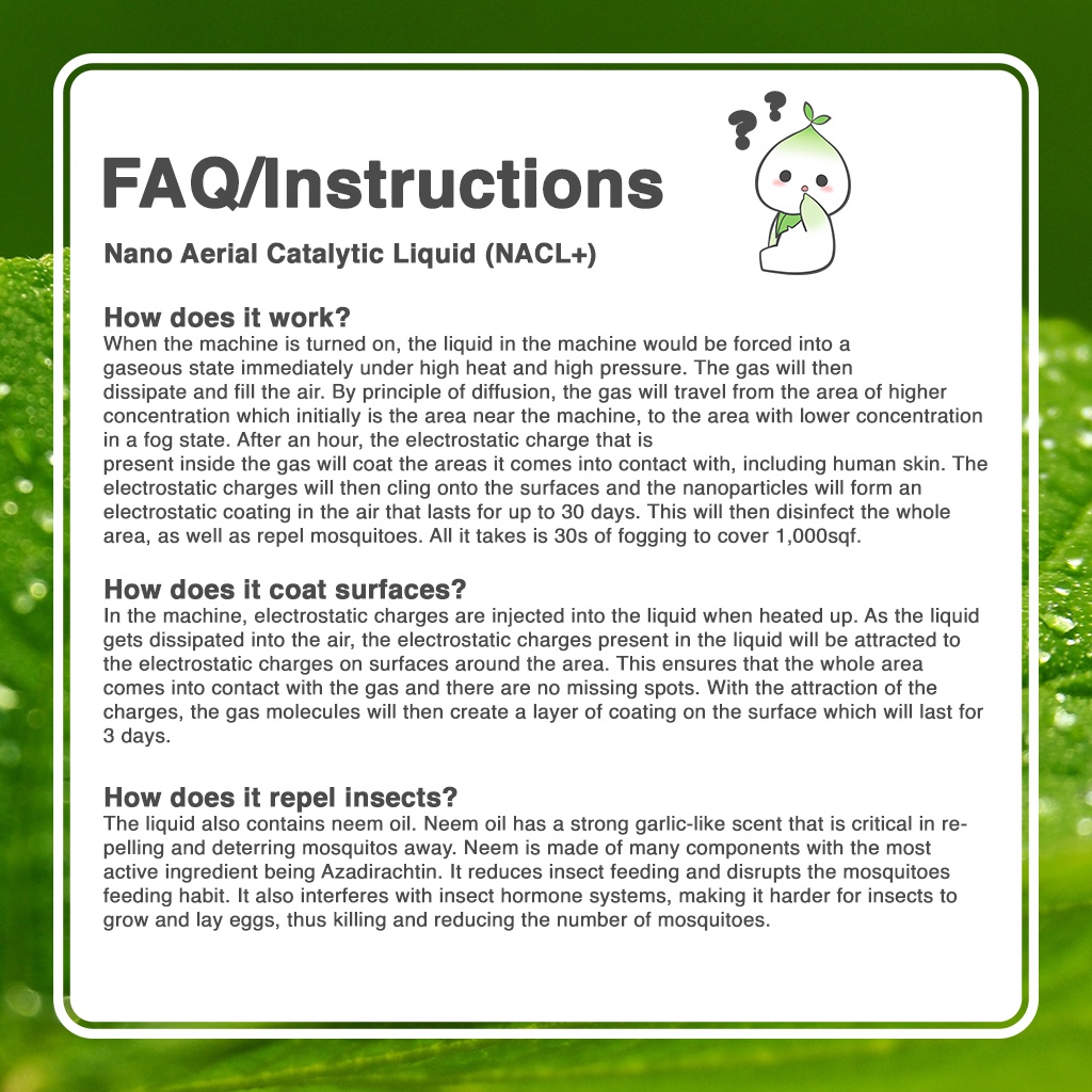 THEO10 has recently launched a Nano Aerial Catalytic Liquid + (NACL+). It is a Disinfectant and Repellent Fogging solution that provides disinfecting surfaces as well as repelling mosquitoes. It utilizes the electrostatic charges technology to coat surfaces in an area which allows the area to be disinfectant and mosquito-free.