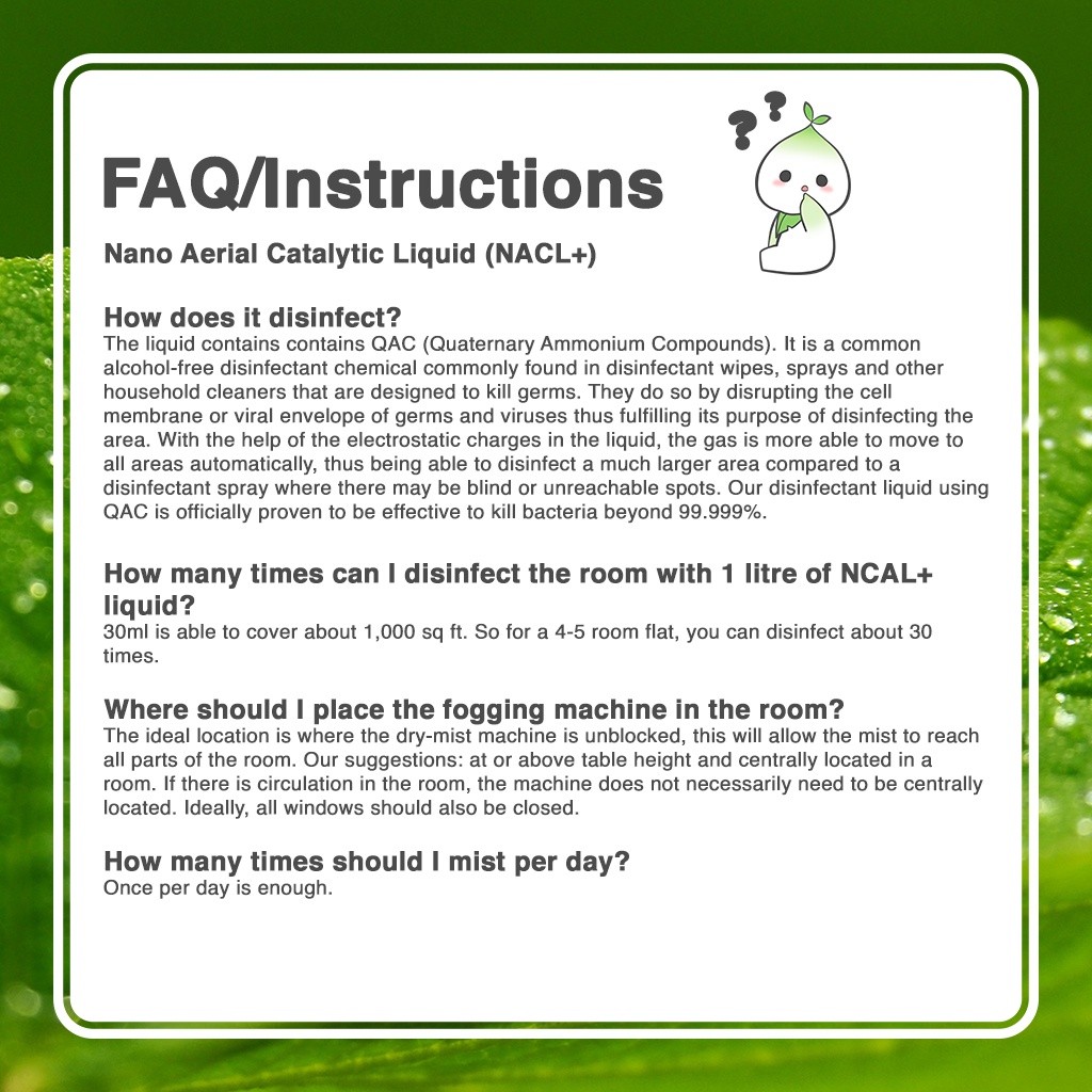 For use in Fogging Machine, pour NACL+ into the small bottle provided and heat up the machine before activating it. It is most recommended to utilize NACL+ as directed in this manner.