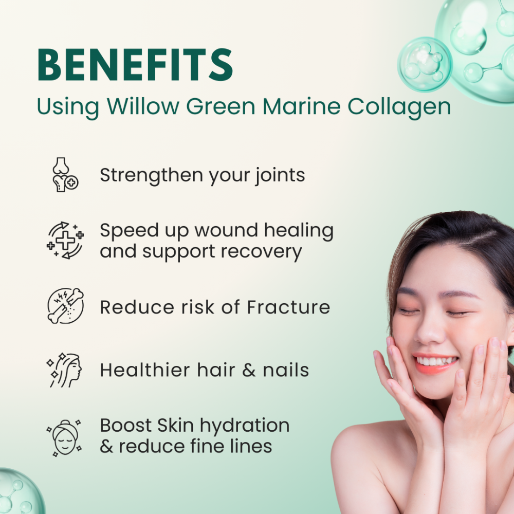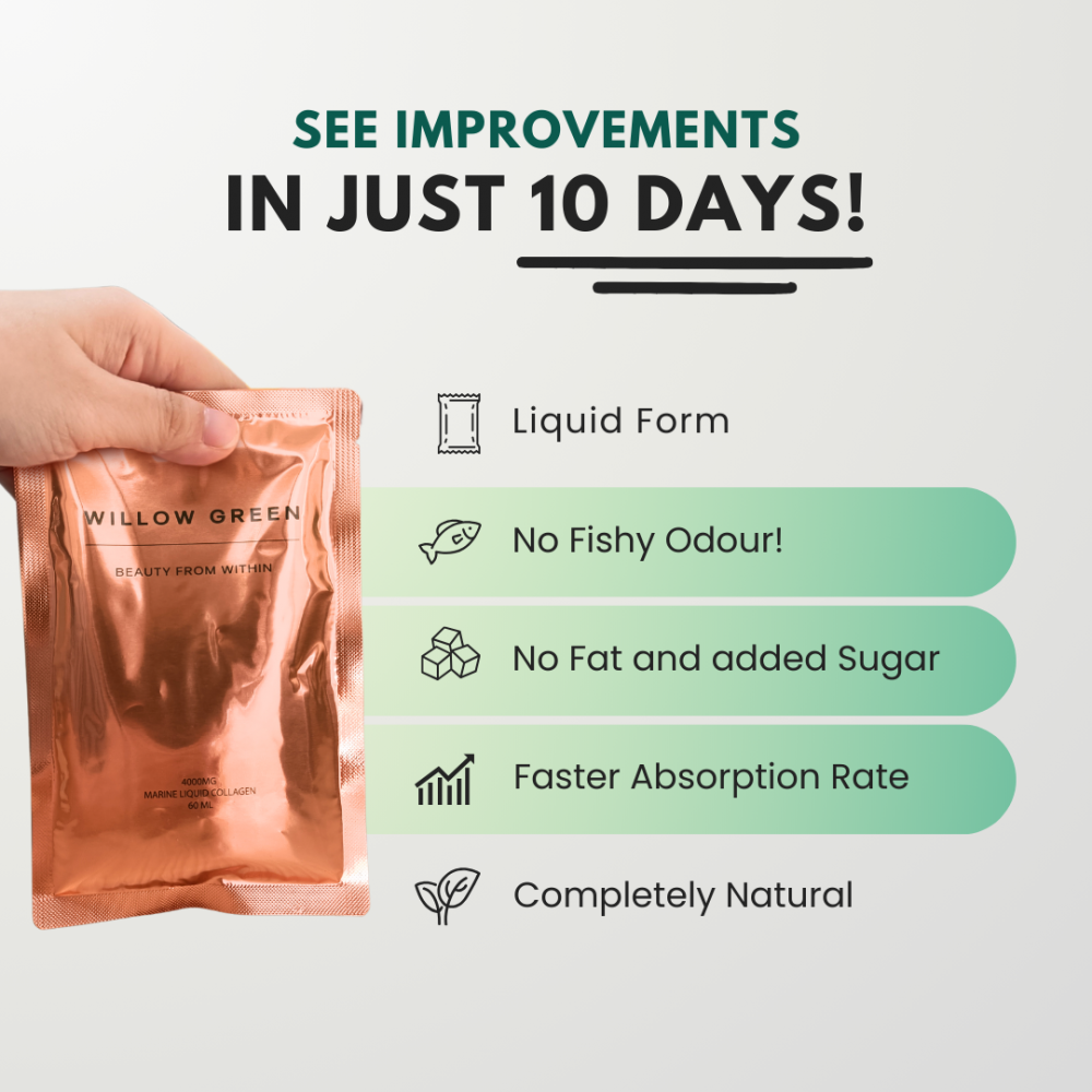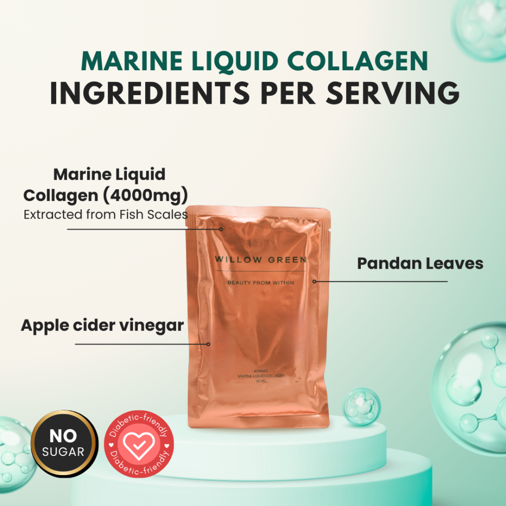 Willow Green Liquid Collagen is made with 100% clean label marine collagen, slow-cooked from premium fish scales — not beef skin or fish innards. This ensures purity, safety, and a neutral taste that blends easily into both sweet and savory dishes.