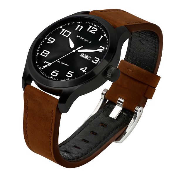 ARIES GOLD AUTOMATIC ESCALATE BLACK STAINLESS STEEL G 9017 BK-BK BROWN LEATHER STRAP MEN'S WATCH