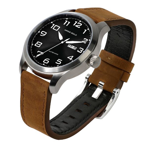 ARIES GOLD AUTOMATIC ESCALATE SILVER STAINLESS STEEL G 9017 S-BK BROWN LEATHER STRAP MEN'S WATCH