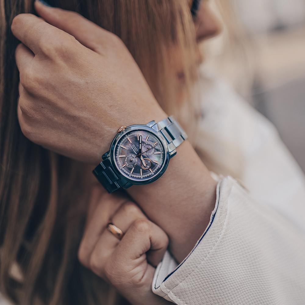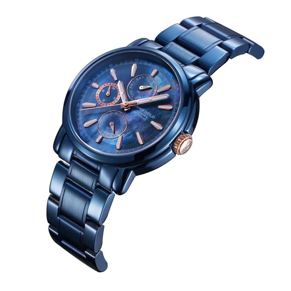 Complementing the male counterpart, the Contender Female holds its own with delicate beauty beneath a veneer of strength. Anti-rust plating adds high corrosion resistance to the 38 mm steel case, yielding undiminished splendor for the head turner who segues from sidewalk to the catwalk.