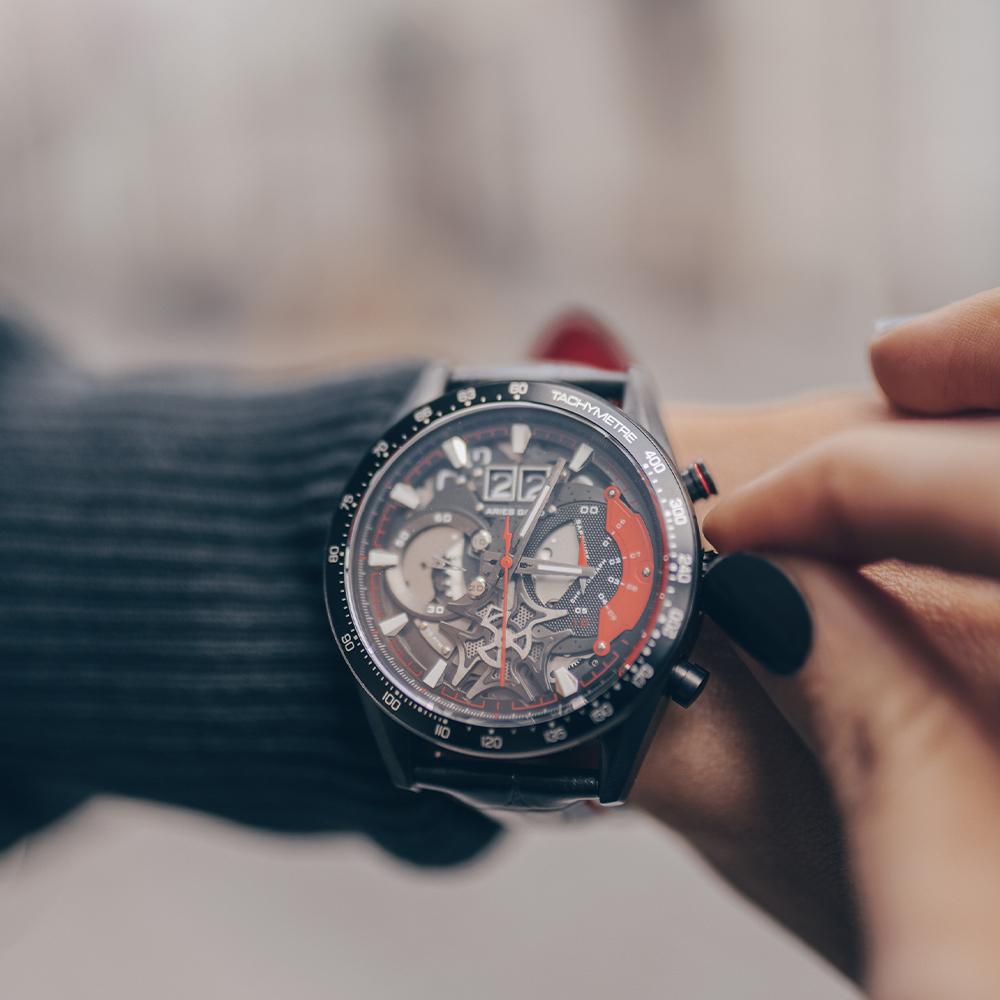 A design that takes no shame in its steampunk inspirations. With a brushed angular case, bold multi-layered skeletonized dial, finished with circular graining and brushes as a final touch to the overall aesthetic. The Jolter is a timepiece reserved only for the bold. Its multi-dimensional dial construction, allowing you to peer into its mechanism, exposing the date wheels, and gear trains, is a testament to our attention to detail for all of our timepieces.