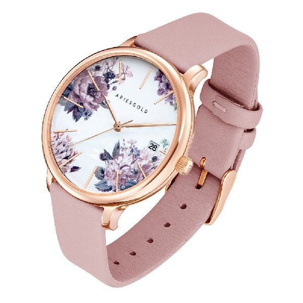 ARIES GOLD ENCHANT FLEUR ROSE GOLD STAINLESS STEEL L 5035A RG-PUFL PINK LEATHER STRAP WOMEN'S WATCH