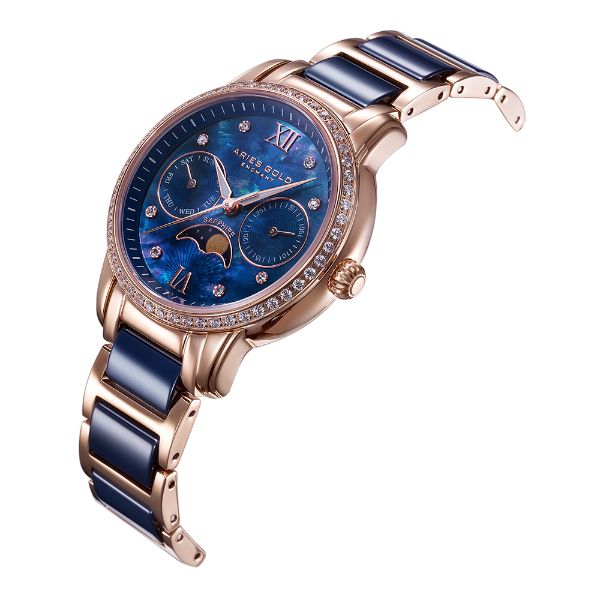 When a body of celestial artistry meshes seamlessly with the elements in its orbit, an exquisite phenomenon is born. Comprising of a stainless-steel bracelet with ceramic interweave, the Luna is a sight to behold, as a ravishing crystal-studded bezel straddles a 34mm casing. Under its outer glory, a layer of scratch-resistant sapphire glass encases the resplendent Mother of Pearl dial. An inbuilt multifunction movement operates day and half-hour hour registers – flanking the Luna's trademark moon phase indicator, a luxurious tribute to the wonders of astronomy.