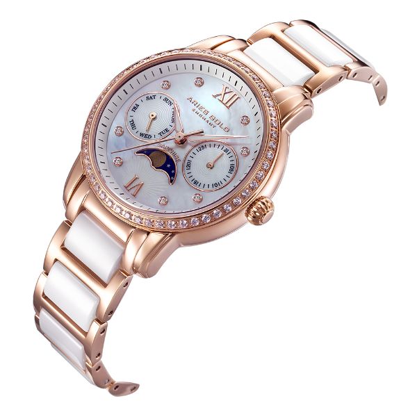 When a body of celestial artistry meshes seamlessly with the elements in its orbit, an exquisite phenomenon is born. Comprising of a stainless-steel bracelet with ceramic interweave, the Luna is a sight to behold, as a ravishing crystal-studded bezel straddles a 34mm casing. Under its outer glory, a layer of scratch-resistant sapphire glass encases the resplendent Mother of Pearl dial. An inbuilt multifunction movement operates day and half-hour hour registers – flanking the Luna's trademark moon phase indicator, a luxurious tribute to the wonders of astronomy.