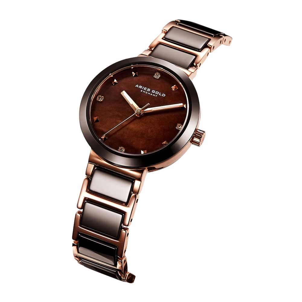 ARIES GOLD ENCHANT PERSIA ROSE GOLD STAINLESS STEEL L 5006Z RG-BRMP BROWN CERAMIC WOMEN'S WATCH