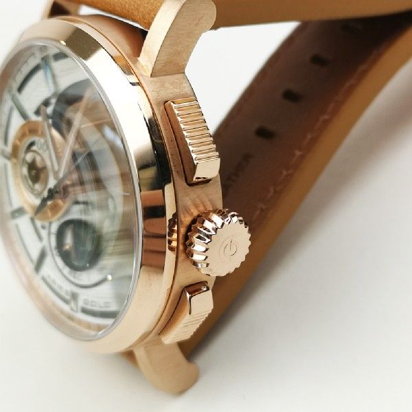 A vintage style rounded and brushed case leading to straight simple lugs offers an unmistakable and distinct silhouette.
