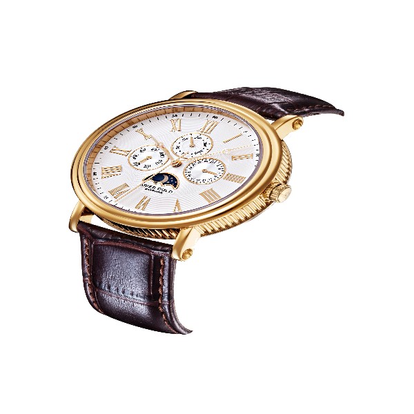 A timepiece that celebrates and embodies the intricate and artistic designs of an age-old complication: The triple calendar and sun/moon indicator. With elegant roman numerals and Breguet hands, along with detailed finished such as the coin edge centre case and hobnail guilloche patterning on the dial, the Kensington offers what is commonly known to be an inaccessible complication and design at an affordable level to the masses.