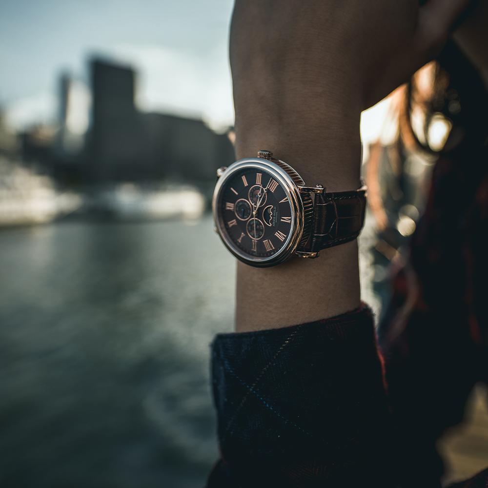 A timepiece that celebrates and embodies the intricate and artistic designs of an age-old complication: The triple calendar and sun/moon indicator. With elegant roman numerals and Breguet hands, along with detailed finished such as the coin edge centre case and hobnail guilloche patterning on the dial, the Kensington offers what is commonly known to be an inaccessible complication and design at an affordable level to the masses.