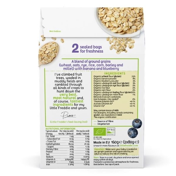 Organic Wheat Flour (Gluten)(76%), Organic Banana Powder (8%), Organic Blueberry Powder (3%), Organic Wholegrain Oat Flour (Gluten)(3%), Organic Wholegrain Rye Flour (Gluten)(2%),Organic Rice Flour (2%), Organic Corn Flour (2%), Organic Wholegrain Barley Flour (Gluten)(2%), Organic Wholegrain Millet Flour (1%), Minerals (Calcicum Carbonate, Ferric Pyrophospate, Zinc Oxide)(1%), Thiamin(Vitamin B1)(<0.1%), Acetate(Vitamin A)(<0.1%), Vitamin D3(<0.1%)No Organic certification