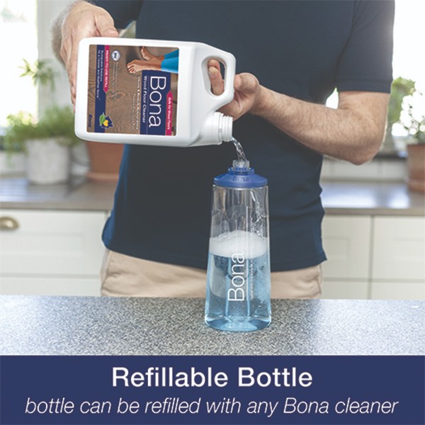 Bona Wood Floor Cleaner refillable bottle is for use with the Bona Premium Spray Mop. It is specifically designed to remove dust, dirt and grime safely from wood floors. Its ready-to-use formula dries quickly, and doesn't leave a residue behind.