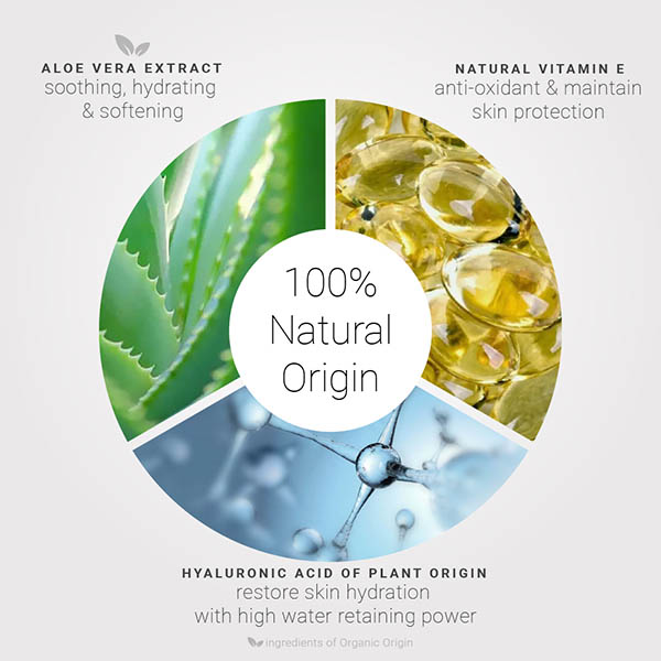 Enriched with hydro-fixing Hyaluronic Acid of vegetable origin, antioxidant natural vitamin E, combined with soothing organic Aloe Vera, favours the rehydration and protection of the skin's hydrolipidic film.