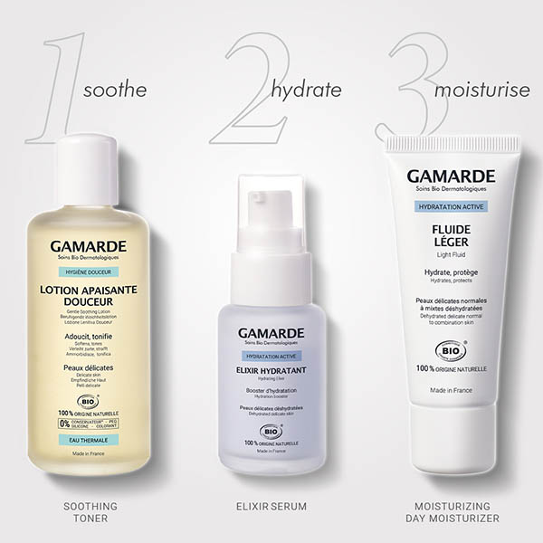 Aqua (Water), Gamarde aqua (Gamarde Water), Aloe barbadensis leaf extract*, Helianthus annuus (Sunflower) seed oil*, parfum (Fragrance), Glycerin, silica, polyglyceryl-3-methylglucose distearate, glyceryl stearate citrate, Jojoba esters, xylitylglucoside, anhydroxylitol, Helianthus annuus (Sunflower) seed wax, Argania spinosa (Argan) kernel oil*, isostearyl avocadate, olive oil decyl esters, squalene, glyceryl caprylate, Cymbopogon martini (Palmarosa) oil*, Cinnamomum camphora (Camphor) bark oil, sodium hyaluronate, tocopherol, xylitol, Acacia decurrens flower wax, polyglycerin-3, xanthan gum, citric acid, citral, farnesol, geraniol, limonene, linalool