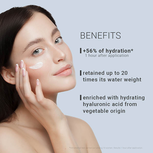 Hyaluronic Acid of natural origin obtained from maize and wheat by bio-fermentation, the molecular structure of which allows up to 20 times its weight in water to be retained, which effectively restores the skin's hydration.