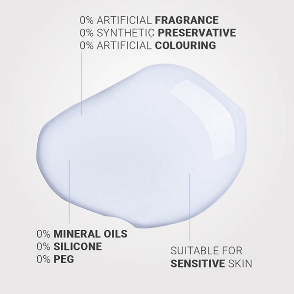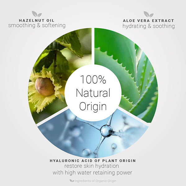 Enriched with soothing organic Aloe Vera and Hyaluronic Acid of vegetable origin.