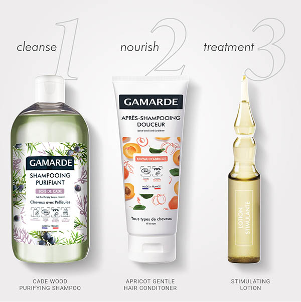 Ideal for hair with dandruff. It purifies your scalp thanks to the purifying properties of Cade Wood and soothing Gamarde-les-Bains Thermal Water. Perfectly cleansed, your hair is soft to the touch and easy to comb.