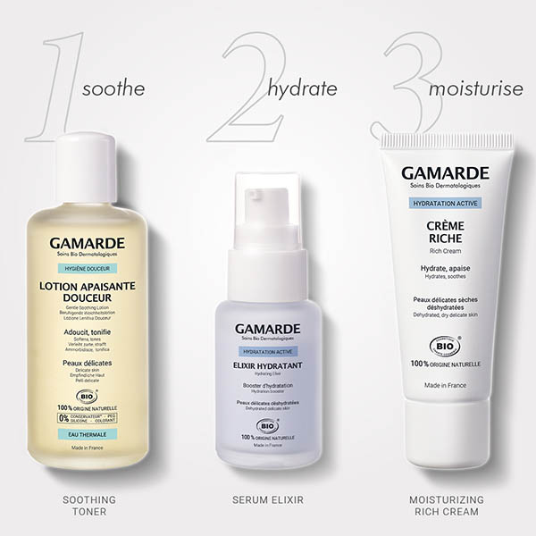 Made with Gamarde-les-Bains Spa Water and Cornflower, it completes make-up removal by cleansing the skin of all remaining impurities from the skin and tones the epidermis. It brings comfort and softness to sensitive skin.