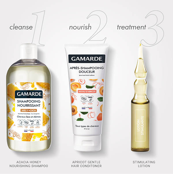 Long-lasting nourishment for dry and damaged hair. it nourishes your hair thanks to the virtues of Acacia Honey and soothing Gamarde-Les-Bains Thermal Spring Water.