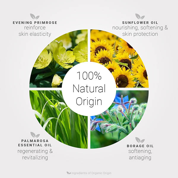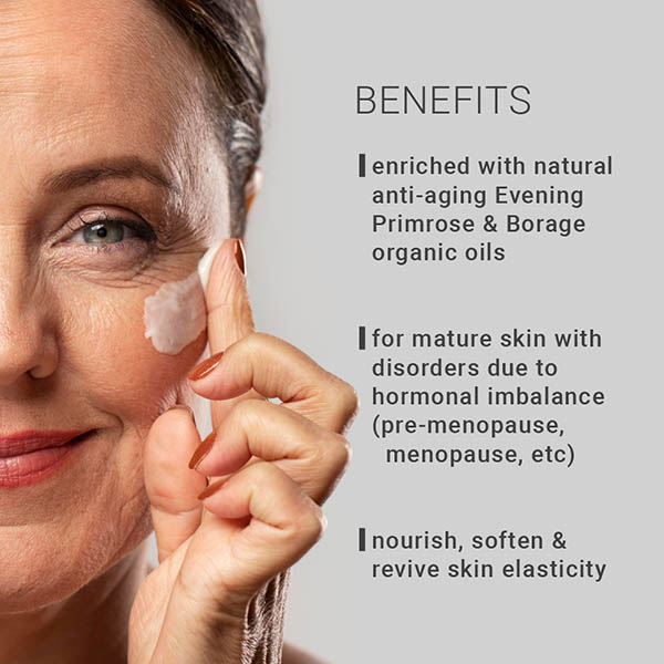 Dedicated to mature skin lacking in nutrition and tone, with hormonal imbalances (pre-menopause, menopause, etc.), it contains organic oils of softening Borage and Evening Primrose rich in fatty acids. The skin is nourished, it regains vitality and comfort.