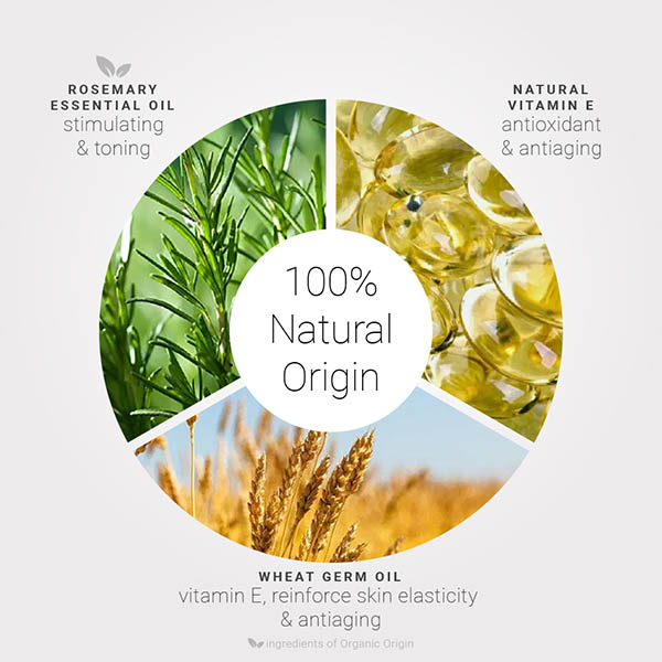 An anti-oxidant and anti-aging concentrate composed of Wheat Germ Oil which strengthens the elasticity of the skin, toning organic Rosemary Essential Oil and natural Vitamin E. The skin is nourished and repaired, wrinkles fade.