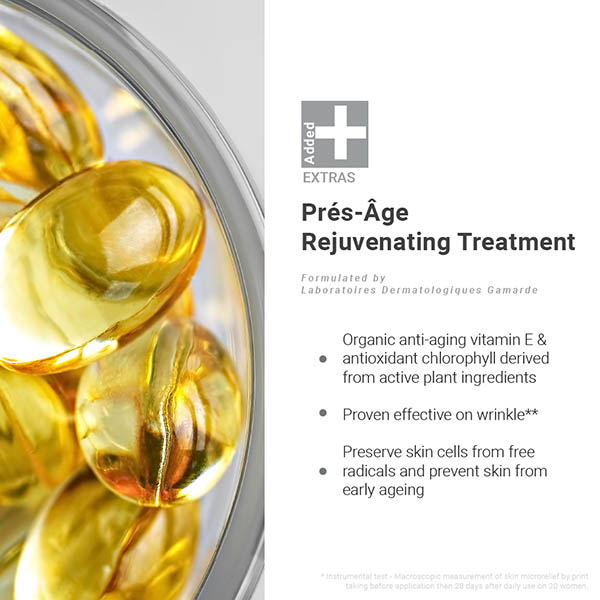 New Pres-Age Rejuvenating Treamtent, formulated by Laboratoires Dermatologiques Gamarde, preserves mature skin cells from free radicals and prevents skin from early ageing.
