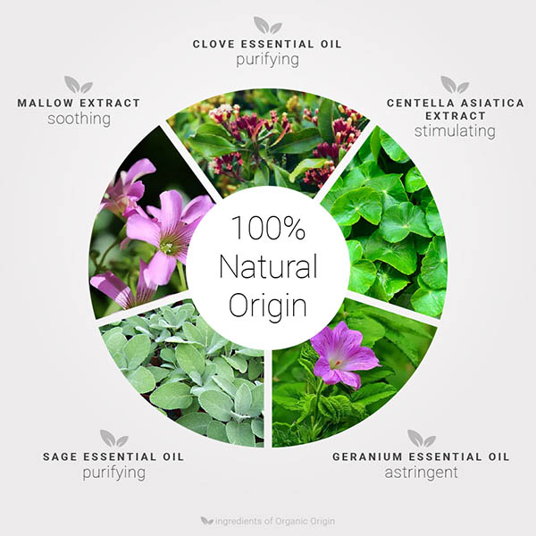 Alcohol*, Centella asiatica leaf extract*, Lavandula latifolia (Lavender) herb oil*, Ononis spinosa root extract*, Malva sylvestris (Mallow) flower extract*, Drosera rotundifolia extract, Ribes nigrum (Black Currant) leaf extract*, Hypericum perforatum flower extract*, Viscum album (Misteltoe) extract*, Citrus limon (Lemon) peel oil*, Salvia officinalis (Sage) oil*, Origanum vulgare oil*, Pelargonium graveolens flower oil*, Eugenia caryophyllus (Clove) bud oil*, citral°, citronellol°, coumarin°, eugenol°, geraniol°, limonene°, linalool°.*ingredient of Organic origin °ingredient naturally present in essential oils