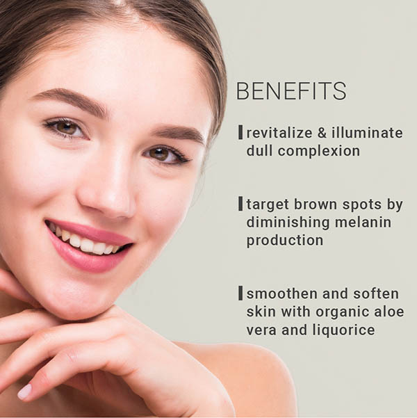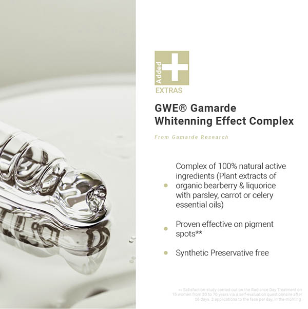 Formulated With GWE® lightening complex of 100% natural active ingredients, extracted from organic bearberry & liquorice with parsley, carrot or celery essential oils.