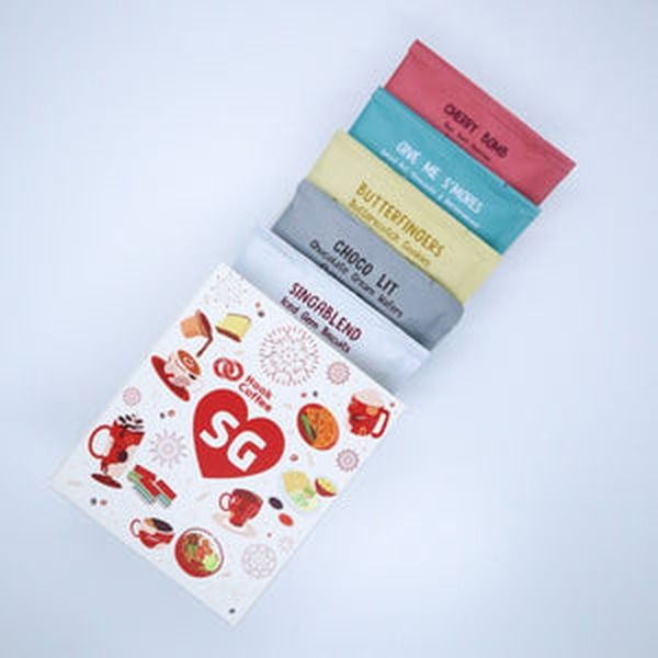 Hook Coffee loves Singapore! And we love our food too! So, what better way to enjoy our National Day celebrations than to bring our favourite local fare together with out unique blends? Each box comes with 5 different coffees, each best paired with an iconic local dish! - Choco Lit - Singablend - Butterfingers - Give Me Smores - Cherry Bomb