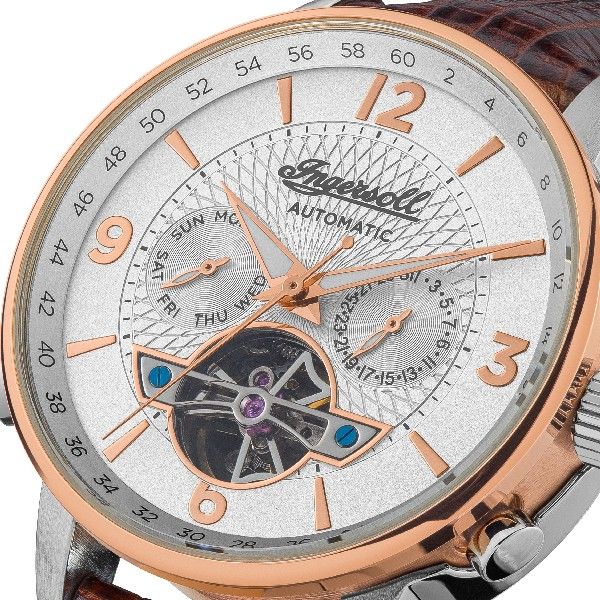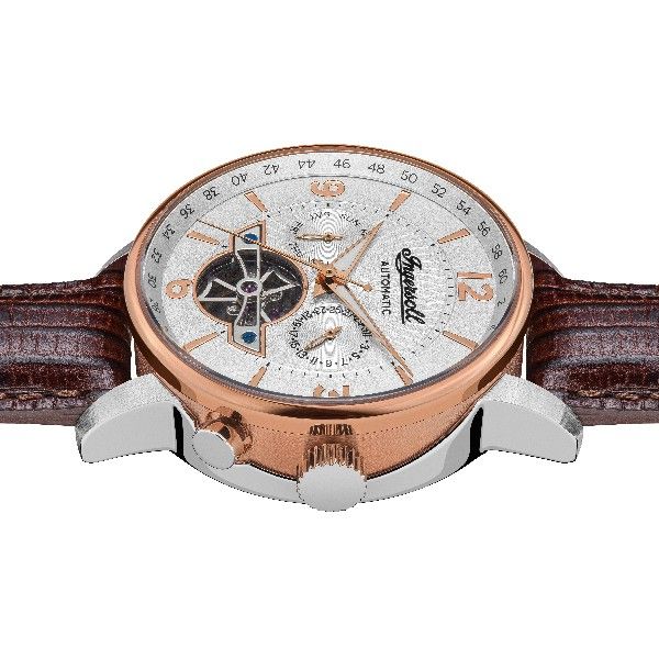 A fine piece of watchmaking, this Ingersoll watch strikes with its immaculate and detail-rich design. It reveals a heartbeat aperture that showcases the inner workings of the watch along with lustrous and easy-to-read applied index hour markers and Arabic numerals. The day, date and seconds ring readings give a multi-dimensional timekeeping to the wrist. The time instrument is complete with a luxurious textured leather strap and a pin and buckle clasp.