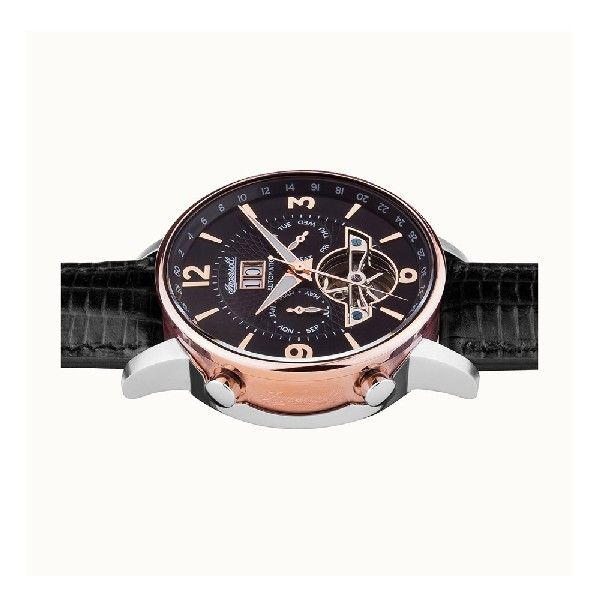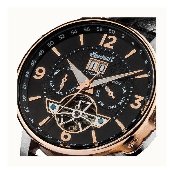 The distinctive black dial is complimented by a balance wheel located right above the 6 o'clock mark. The automatic movement is contained in rose gold /silver casing giving the watch its character and personality.