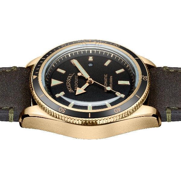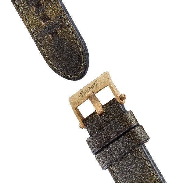 A vintage inspired bronze timepiece. The Radiolite dial with luminous hands and markers contrasts against the black dial and bezel, a nod to our watchmaking heritage as the first company to produce a watch that allowed the wearer to be able to tell the time in the dark. Presented on a handmade olive green Horween leather strap that is renowned for its quality and durability. The bronze case will naturally change its aesthetic over time, developing a unique patina. Limited to 300 pieces with individually numbered case backs and for the first time housed in a luxury Ingersoll black oak veneer watch winder.