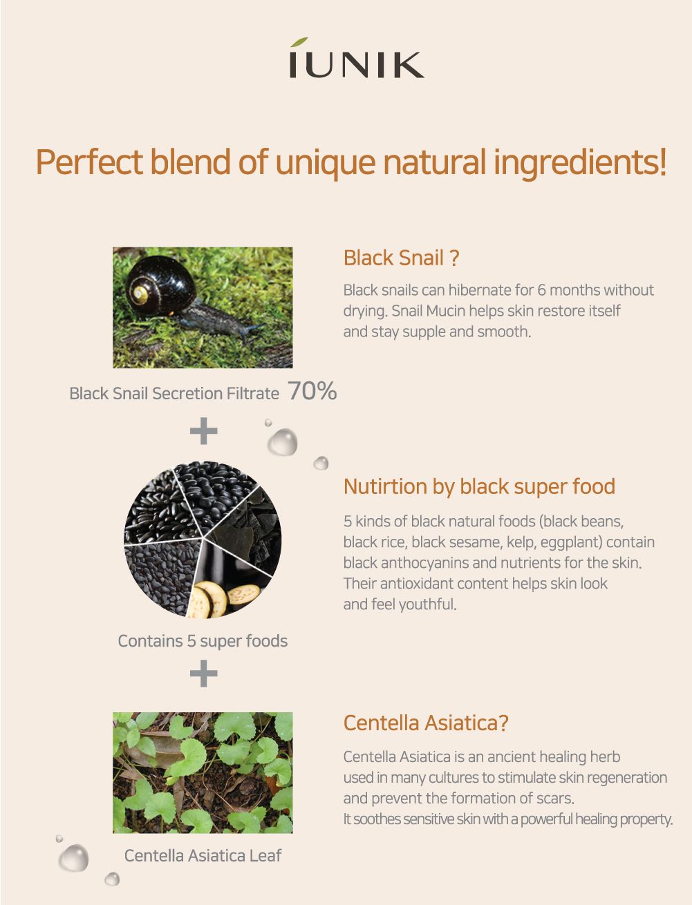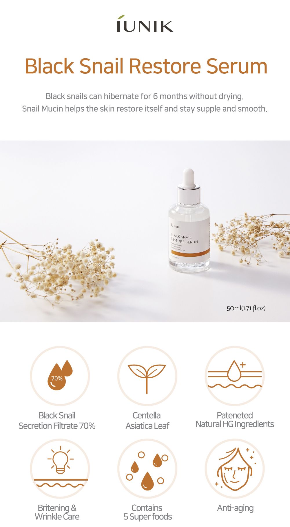 1. True to its word, iUnik Black Snail Restore Serum has Black Snail Secretion Filtrate in a concentration of 70%. Snail Mucin is rich in Glycolic acid that helps skin restore itself and stay supple and smooth. This is the secret to the beautiful skin that defies age. Glycolic acid supplements the collagen thereby making the skin plumper and pliant. It doubles the moisture retention of the skin leaving it soft and lustrous.