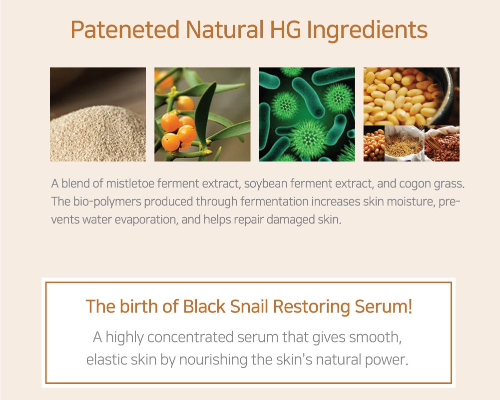 5. Pateneted Natural HG Ingredients are unique to iUnik Black snail Restore Serum. This is a blend of mistletoe extract, soybean ferment extract and cogon grass. The biopolymers produced through fermentation increases skin hydration, prevents water loss and help repair damaged skin.