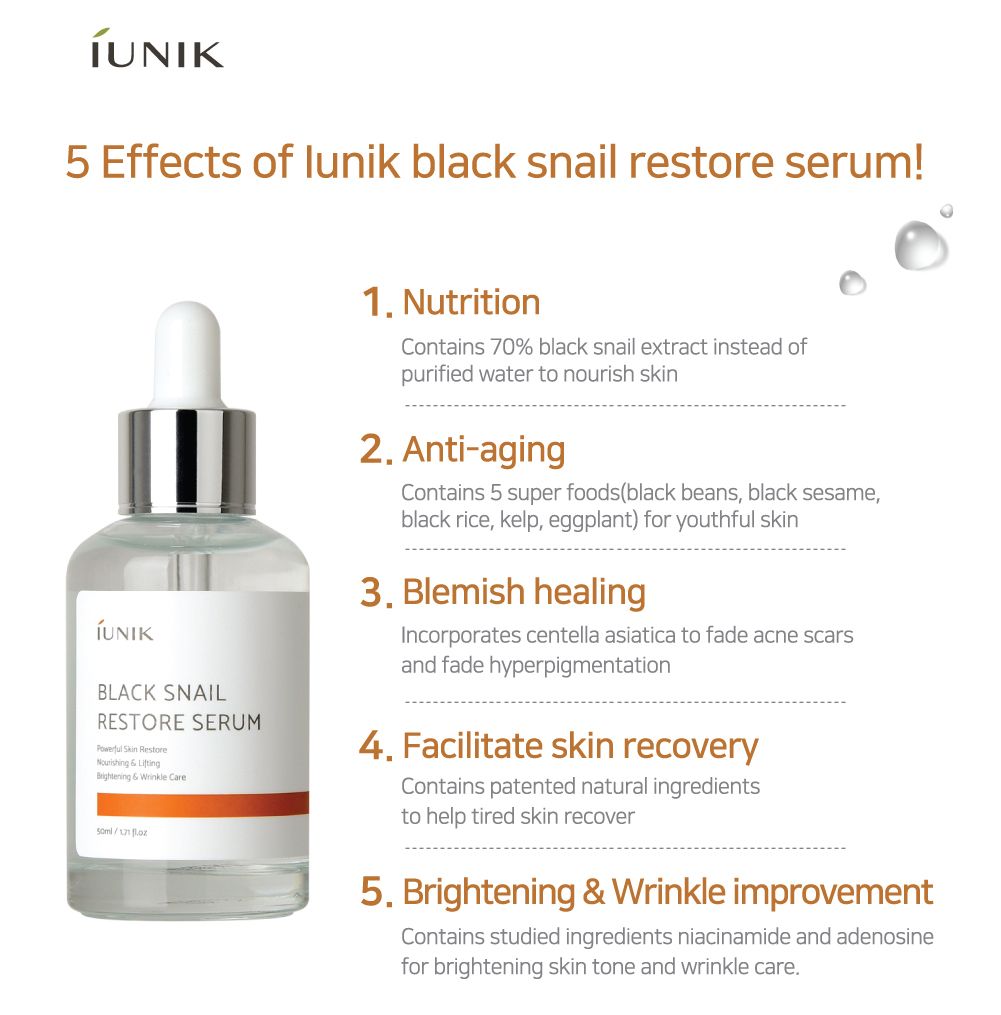 The 5 magical effects of iUnik Black Snail restore Serum include skin nourishment, anti-ageing , skin rejuvenation, repair and healing and skin lightening are all attributed to its special constituents.