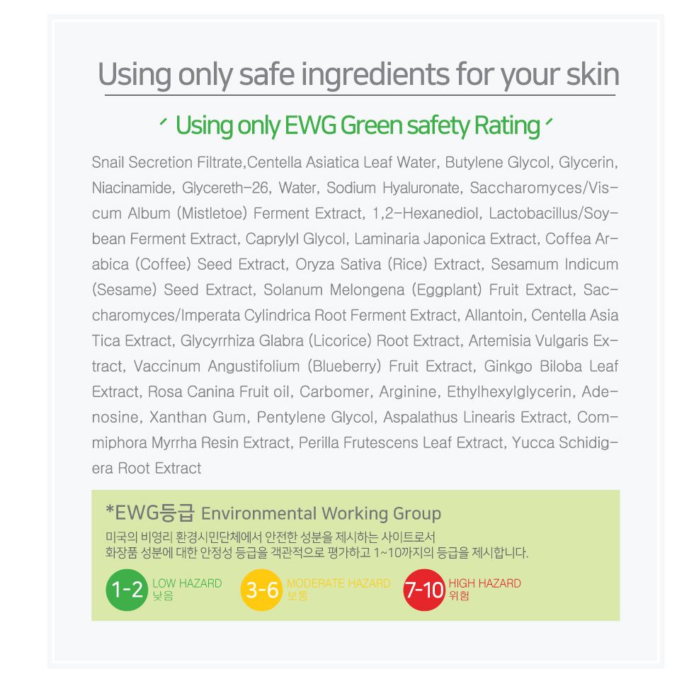 Snail Secretion Filtrate, CentellaAsiatica Leaf Water, Methylpropandediol, Glycerin, Niacinamide, Glycereth-26, Water, 1,2-Hexanediol, Sodium Hyaluronate, Saccharomyces/Viscum Album (Mistleto) Ferment Extract, Lactobacillus/Soybean Ferment Extract, Laminaria Japonica Extract, Glycine Soja (Soybean) Seed Extract, OryzaSativa (Rice) Extract, SesamumIndicum (Sesame) Seed Extract, Solanum Melongena (Eggplant) Fruit Extract, Saccharomyces/ImperataCylindrica Root Ferment Extract, Caprylyl Glycol, Butylene Glycol, Allantone, CentellaAsiaitaca Extract, GlycyrrhizaGlabra (Licorice) Root Extract, Artemisia Vulgaris Extract