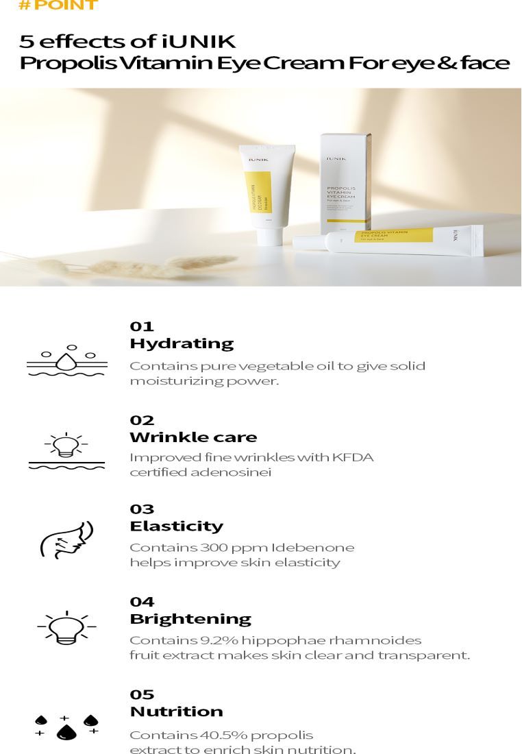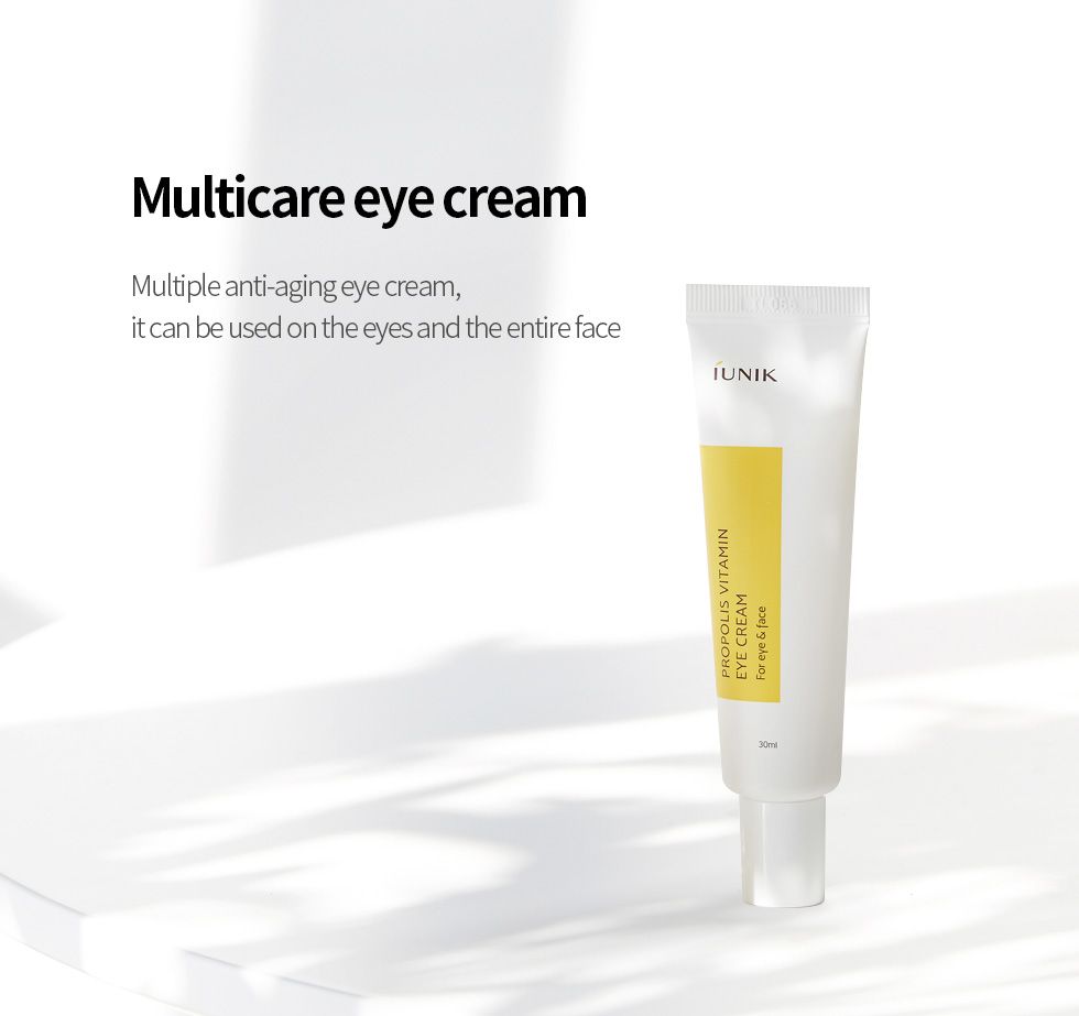 iUnik Propolis Vitamin Eye Cream for Eye and Face is distinct with plant based Propolis extract that bestows antimicrobial properties.