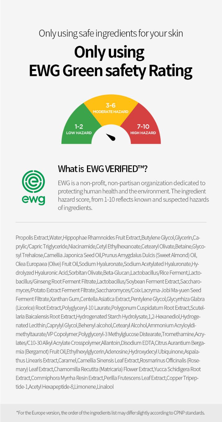 Propolis Extract (40.5%), Water, HippophaeRhamnoides Fruit Extract (0.2%), Butylene Glycol, Glycerin, Caprylic/Capric Triglyceride, Niacinamide, CetylEthylhexanoate, CetearylOlivate, Betaine, Glycosyl Trehalose, Camellia Japonica Seed Oil, Prunus AmygdalusDulcis (Sweet Almond) Oil, OleaEuropaea (Olive) Fruit Oil, Sodium Hyaluronate, Sodium AcrylatedHyaluronate, Hydrolyzed Hyaluronic Acid, SorbitanOlivate, Beta-Glucan, Lactobacillus/Rice Ferment, Lactobacillus/Ginseng Root Ferment Filtrate, Lactobacillus/Soybean Ferment Extract, Saccharomyces/Potato Extract Ferment Filtrate, Saccharomyces/CoixLacryma-Jobi Ma-yuen Seed Ferment Filtrate, Xanthan Gum, CentellaAsiatica Extract, Pentylene Glycol, GlycyrrhizaGlabra (Licorice) Root Extract, Polyglyceryl-10 Laurate, PolygonumCuspidatum Root Extract, ScutellariaBaicalensis Root Extract, Hydrogenated Starch Hydrolysate, 1,2-Hexanediol, Hydrogenated Lecithin, Caprylyl Glycol, Behenyl Alcohol, Cetearyl Alcohol, Ammonium Acryloyl/Dimethyltaurate/VP Copolymer, Polyglyceryl-3 Methylglucose, Distearate, Tromethamine, Acrylates/C10-30 Alkyl Acrylate Crosspolymer, Allantoin, Disodium EDTA, Citrus AurantiumBergamia (Bergamot) Fruit Oil, Ethylhexylglycerin, Adenosine, Hydroxydecyl Ubiquinone (300 ppm), AspalathusLinearis Extract, Caramel, Camellia Sinensis Leaf Extract, RosmarinusOfficinalis (Rosemary) Leaf Extract, ChamomillaRecutita (Matricaria) Flower Extract, Yucca Schidigera Root Extract, Commiphora Myrrha Resin Extract,PerillaFrutescens Leaf Extract, Copper Tripeptide-1, Acetyl/Hexapeptide-8, Limonene, Linalool