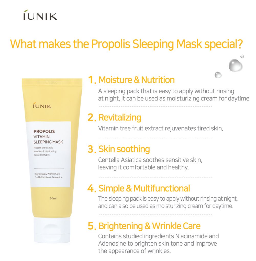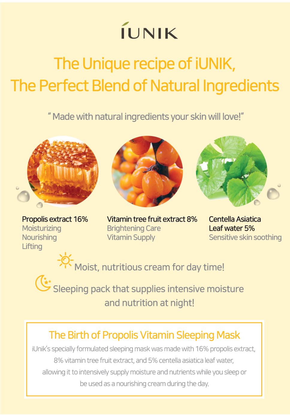 IUnikPropolis Vitamin Sleeping Mask is a simple multi-functional cream that you can use day and night. This sleeping mask is easy to apply. You can leave it on without rinsing at night. The cream hydrates instantly. Its intense moisturisation and nourishment brings back your skin’s natural glow within no time.IUnikPropolis Vitamin Sleeping mask is the nature’s own gift to you for a healthy, supple, smooth and youthful skin that is free from blemishes and wrinkles.