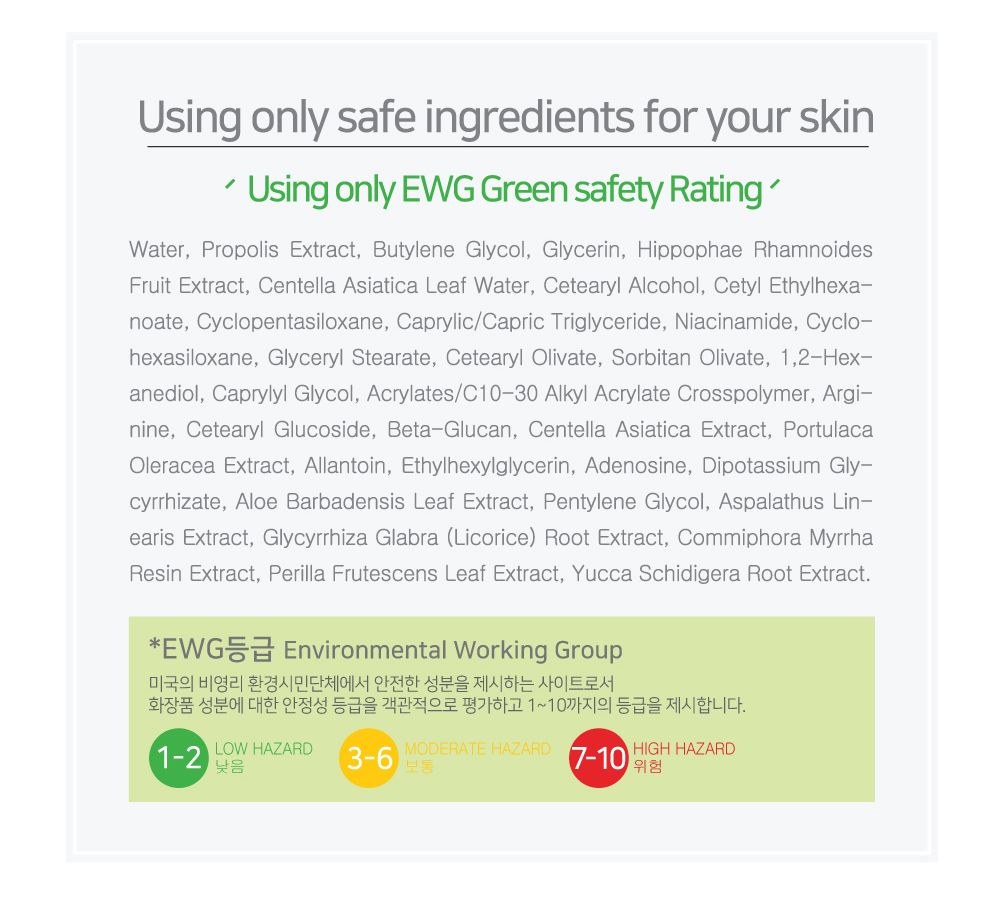 Water, Propolis Extract, Butylene Glycol, Glycerin, HippophaeRhamnoides Fruit Extract, CentellaAsiatica Leaf Water, Cetearyl Alcohol, CetylEthylhexanoate, Cyclopentasiloxane, Caprylic/Capric Triglyceride, Niacinamide, Cyclohexasiloxane, Glyceryl Stearate, CetearylOlivate, SorbitanOlivate, 1,2-Hexanediol, Caprylyl Glycol, Acrylates/C10-30 Alkyl Acrylate Crosspolymer, Arginine, Cetearyl Glucoside, Beta-Glucan, CentellaAsiatica Extract, Portulaca Oleracea Extract, Allantoin, Ethylhexylglycerin, Adenosine, Dipotassium Glycyrrhizate, Aloe Barbadensis Leaf Extract, Pentylene Glycol, AspalathusLinearis Extract, GlycyrrhizaGlabra (Licorice) Root Extract, Commiphora Myrrha Resin Extract, PerillaFrutescens Leaf Extract, Yucca Schidigera Root Extract