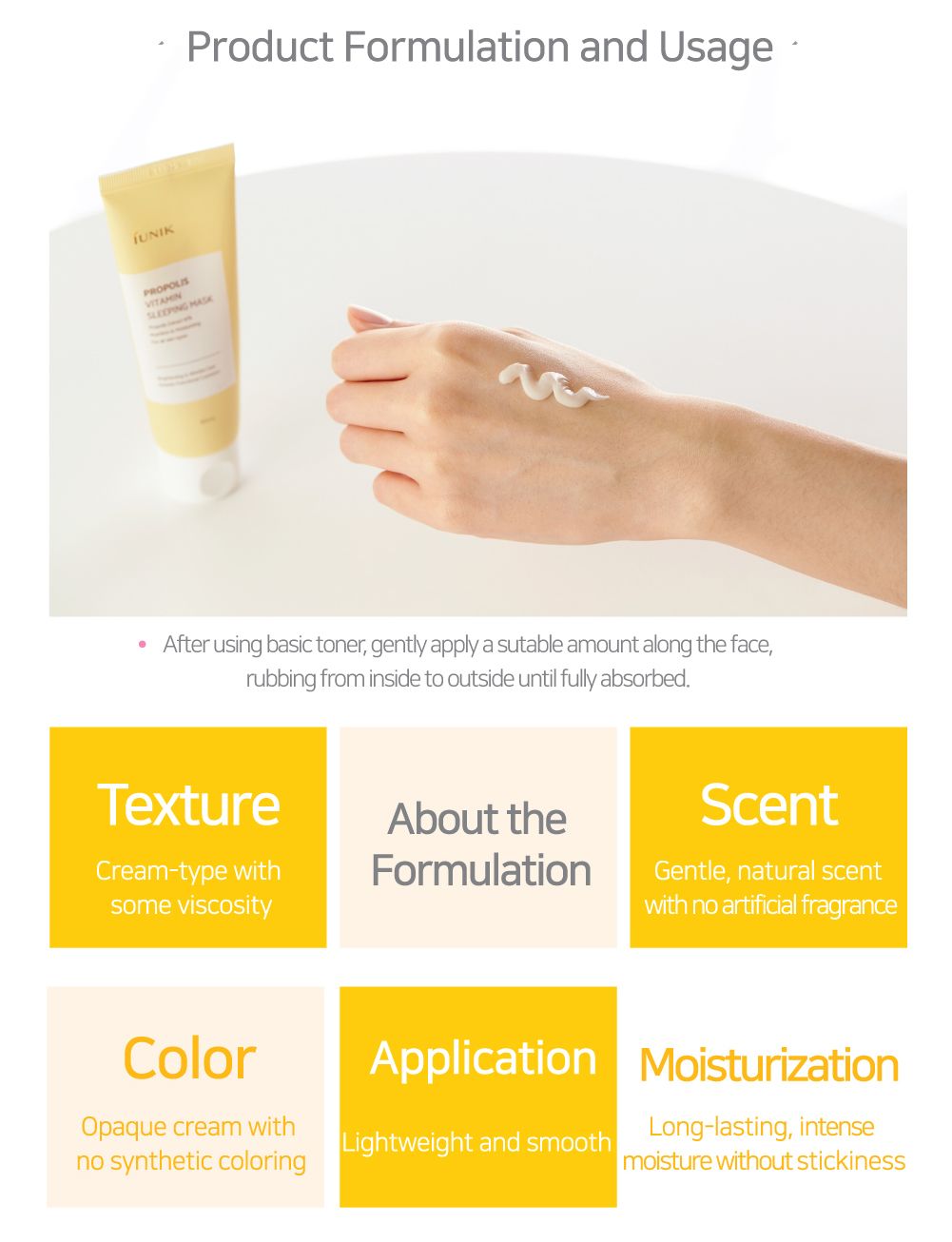 IUnik Propolis Vitamin Sleeping Mask is unique in more ways than one. The first and foremost factor that sets this special cream apart is its dual functionality. This wonderful product can be used as a sleeping pack overnight and it perfectly suits you as regular daytime moisturiser too. This is the quintessential cream that goes hand in hand with Propolis Vitamin Serum giving you the finest results you have wished for.