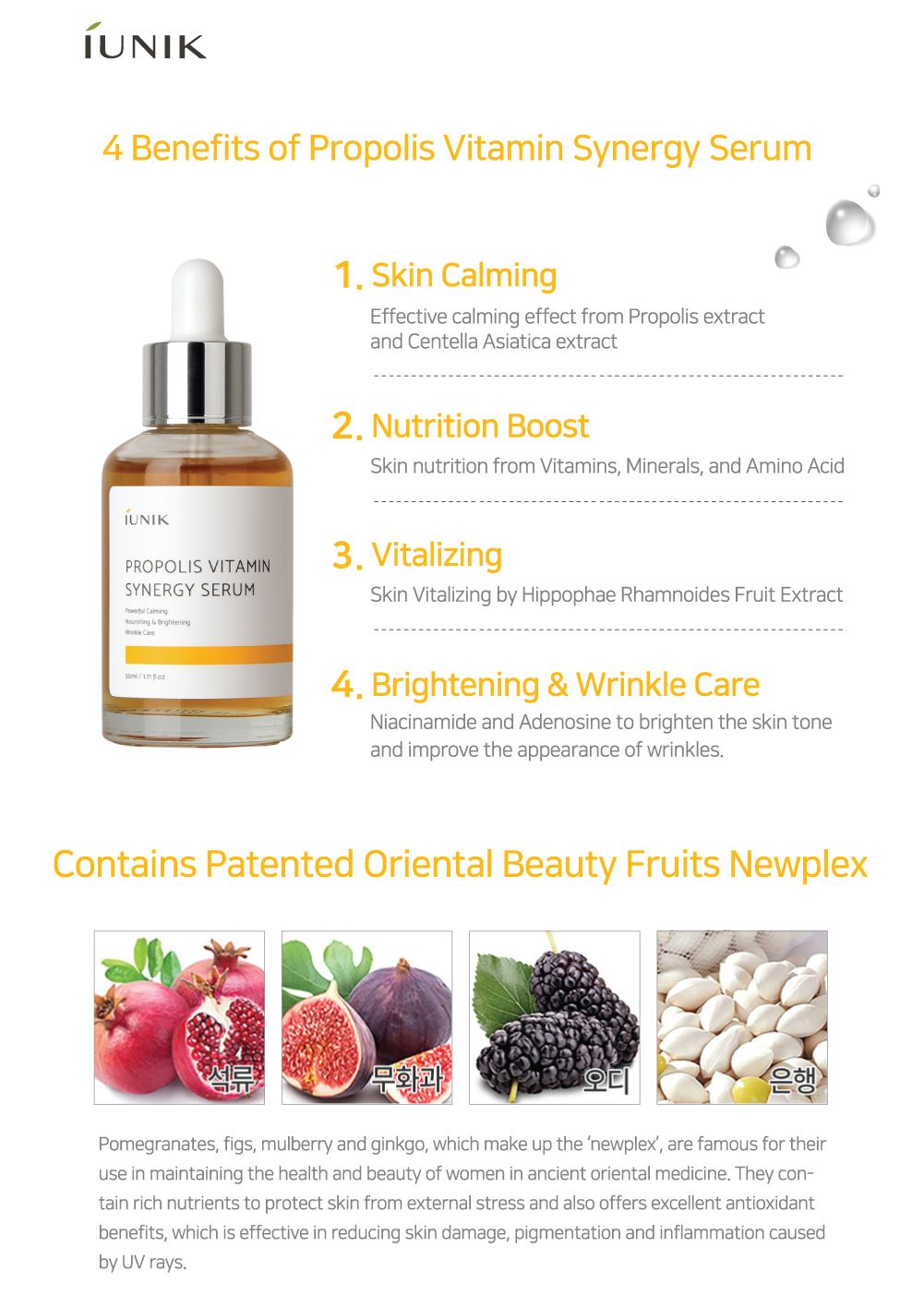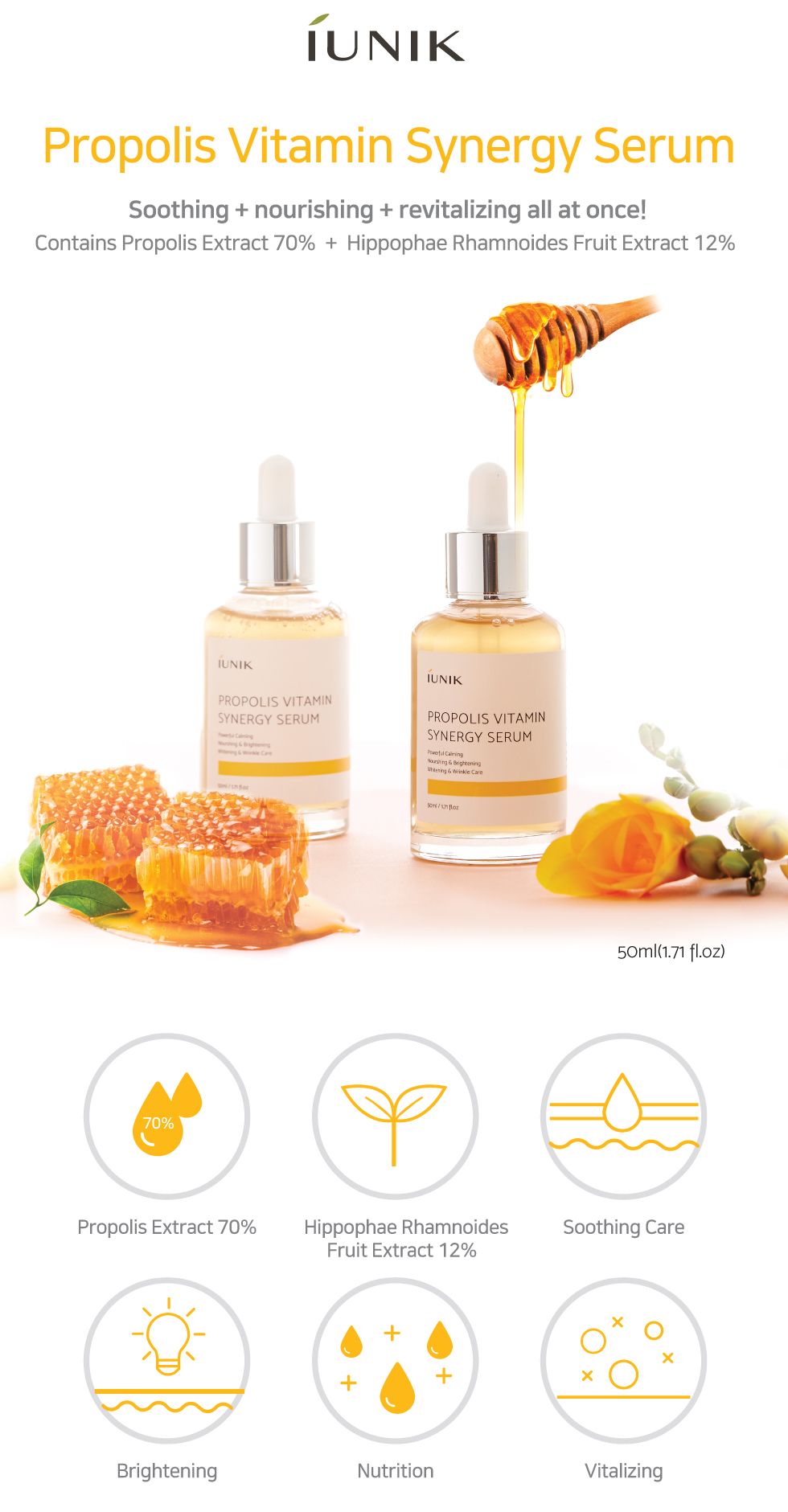 1. 70% of this incomparable serum consists of the richness of Propolis Extract that overflows with moisture and revitalizing nutrition. It carries anti-inflammatory properties to naturally heal up and calm down inflamed skin for an overall protection.