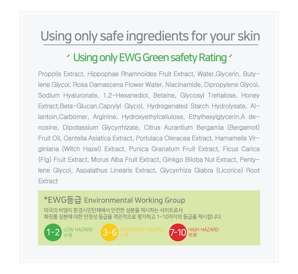 Propolis Extract, HippophaeRhamnoides (Sea Buckthorn) Fruit Extract, Water, Butylene Glycol, Glycerin, Methylpropanediol, Niacinamide, Dipropylene Glycol, 1,2-Hexanediol, Rosa Damascena (Rose) Flower Water, Sodium Hyaluronate, Betaine, GlycosylTrehalose, Honey Extract, Beta-Glucan, Hydrogenated Starch Hydrolysate, Allantoin, Carbomer, Arginine, Hydroxyethylcellulose, Adenosine, Dipotassium Glycyrrhizate, Pentylene Glycol, Citrus AurantiumBergamia (Bergamot) Fruit Oil, CentellaAsiatica (Gotu Kola) Extract, PortulacaOleracea (Green Purslane) Extract, HamamelisVirginiana (Witch Hazel) Extract, PunicaGranatum (Pomegranate) Extract, FicusCarica (Fig) Fruit Extract, Morus Alba (White Mulberry) Fruit Extract, Ginkgo Biloba (Maidenhair Tree) Nut Extract, Caprylyl Glycol