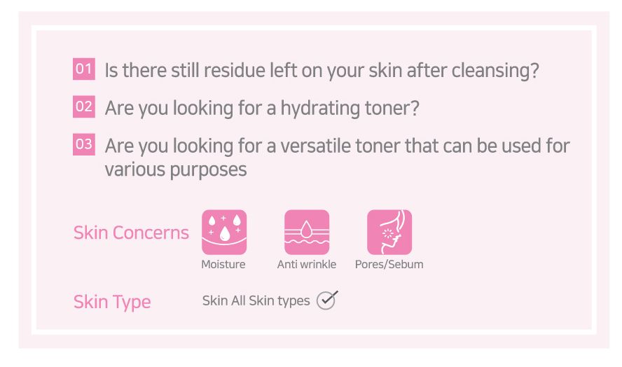 After cleansing, apply the toner gently over the face and neck in a gentle upward sweeping motion using cotton wads or finger-tips. It is suitable for daily use at day and night time.