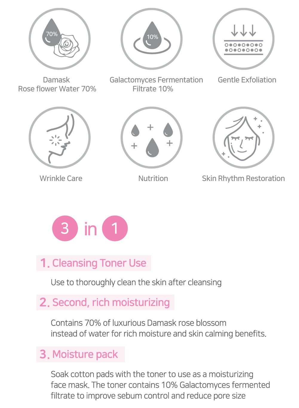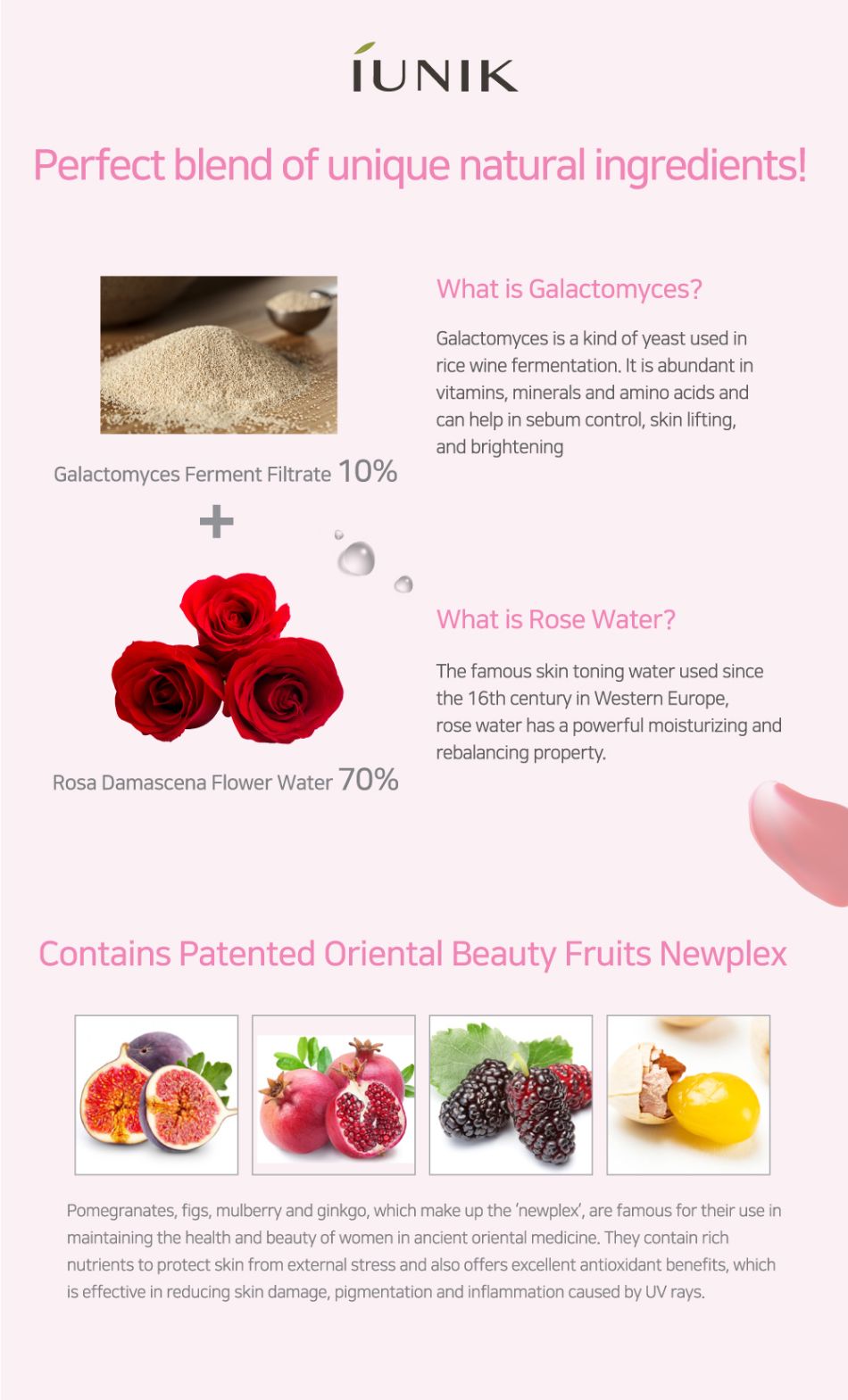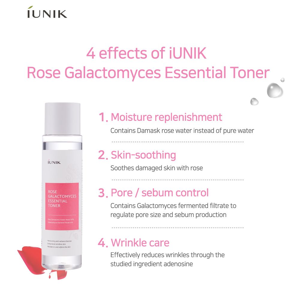 No more nightmare of acne or blackheads . Clear skin becomes dream come true with iUnik Rose Galactomyces Essential Toner. This product is nature’s own gift to enhance beauty naturally. Rich in natural ingredients that bestow anti-inflammatory and antiseptic and alcohol-free astringent actions, this unique toner ensures that your skin blossoms to glory under its gentle care.