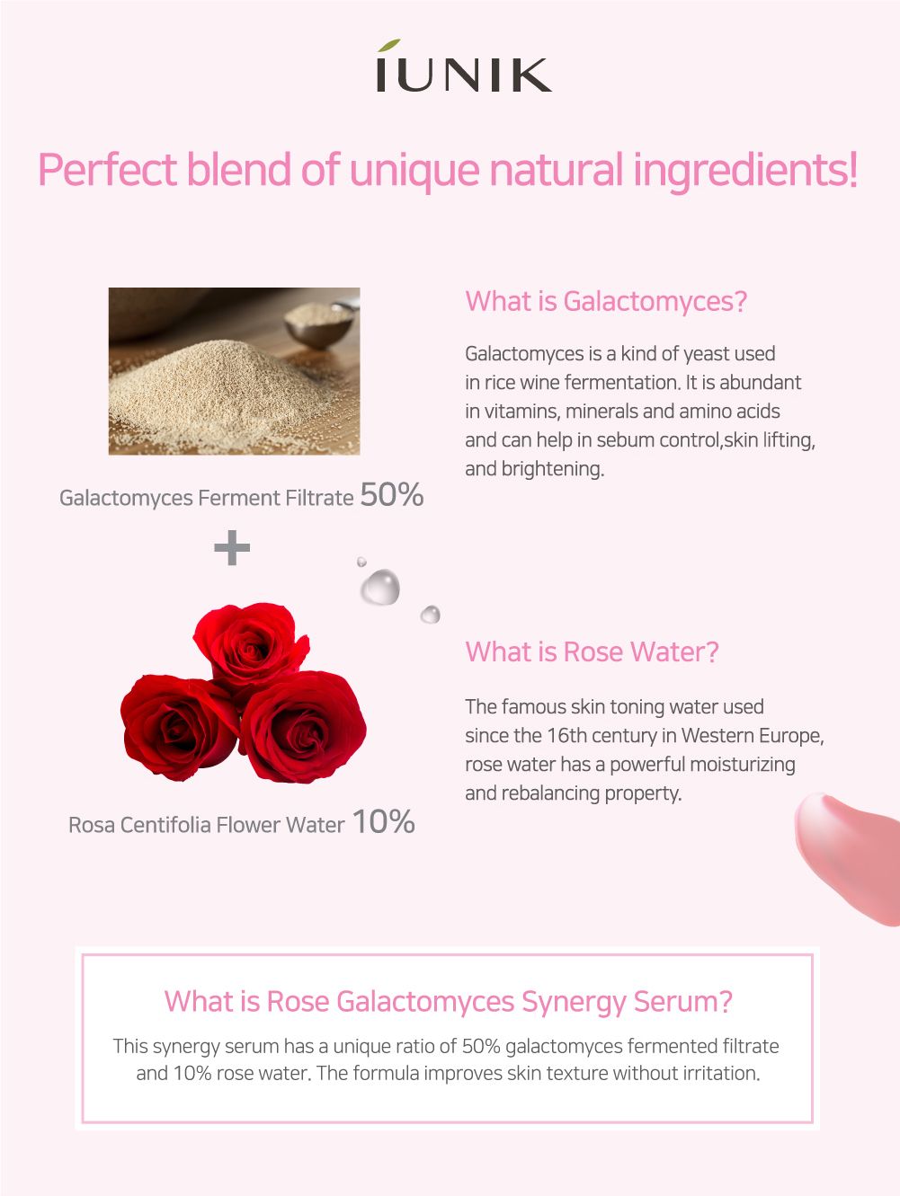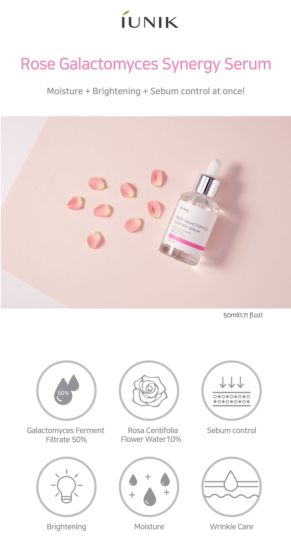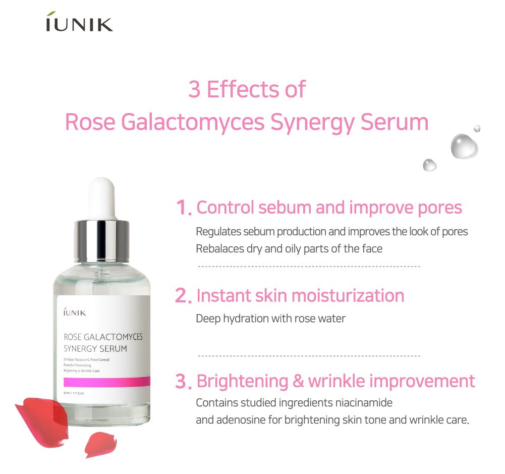 iUnik Rose Galactomyces Synergy Serum is a, clear non-sticky light serum that settles smoothly on the skin with quick absorption on application. It is pleasantly fragrant and free of synthetic dyes. With a strong moisturising effect that lasts all day long, this serum is simply divine.